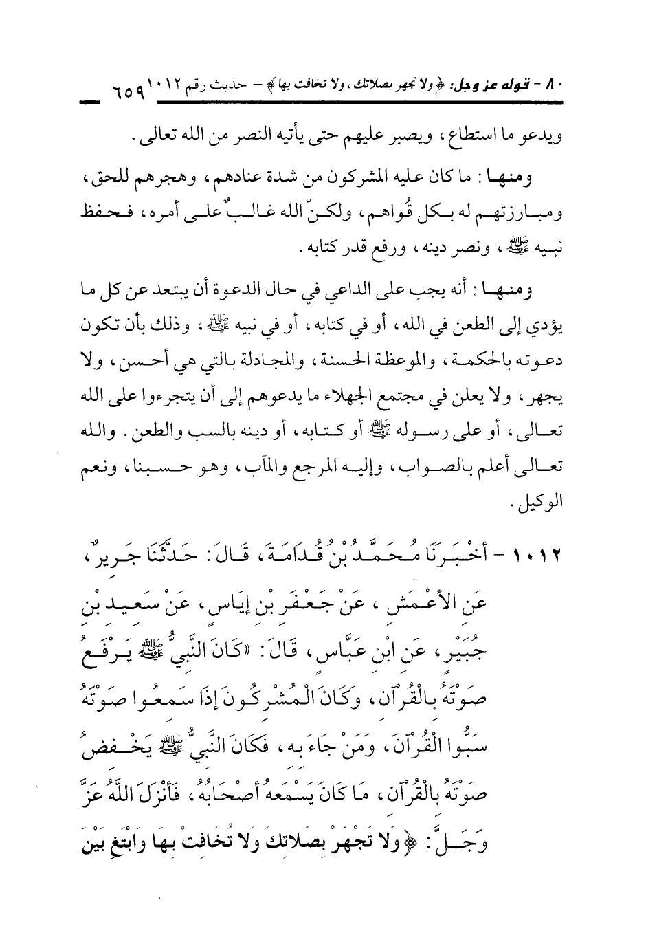 1012 - أَخْبَرَنَا مُحَمَّدُ بْنُ قُدَامَةَ، قَالَ: حَدَّثَنَا جَرِيرٌ، عَنِ الأَعْمَشِ، عَنْ جَعْفَرِ بْنِ إِيَاسٍ، عَنْ سَعِيدِ بْنِ جُبَيْرٍ، عَنِ ابْنِ عَبَّاسٍ، قَالَ: كَانَ النَّبِيُّ - صلى الله عليه وسلم - يَرْفَعُ صَوْتَهُ بِالْقُرْآنِ، وَكَانَ الْمُشْرِكُونَ إِذَا سَمِعُوا صَوْتَهُ سَبُّوا الْقُرْآنَ، وَمَنْ جَاءَ بِهِ، فَكَانَ النَّبِيُّ - صلى الله عليه وسلم - يَخْفِضُ صَوْتَهُ بِالْقُرْآنِ، مَا كَانَ يَسْمَعُهُ أَصْحَابُهُ، فَأَنْزَلَ اللَّهُ عَزَّ وَجَلَّ {وَلَا تَجْهَرْ بِصَلَاتِكَ وَلَا تُخَافِتْ بِهَا وَابْتَغِ بَيْنَ