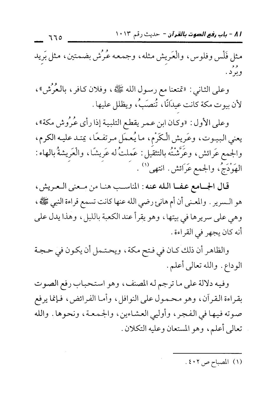 قال الجامع عفا الله عنه: المناسب هنا من معنى العريش، هو السرير. والمعنى أن أم هانئ رضي الله عنها كانت تسمع قراءة النبي - صلى الله عليه وسلم -، وهي على سريرها في بيتها، وهو يقرأ عند الكعبة بالليل، وهذا يدل على أنه كان يجهر في القراءة.