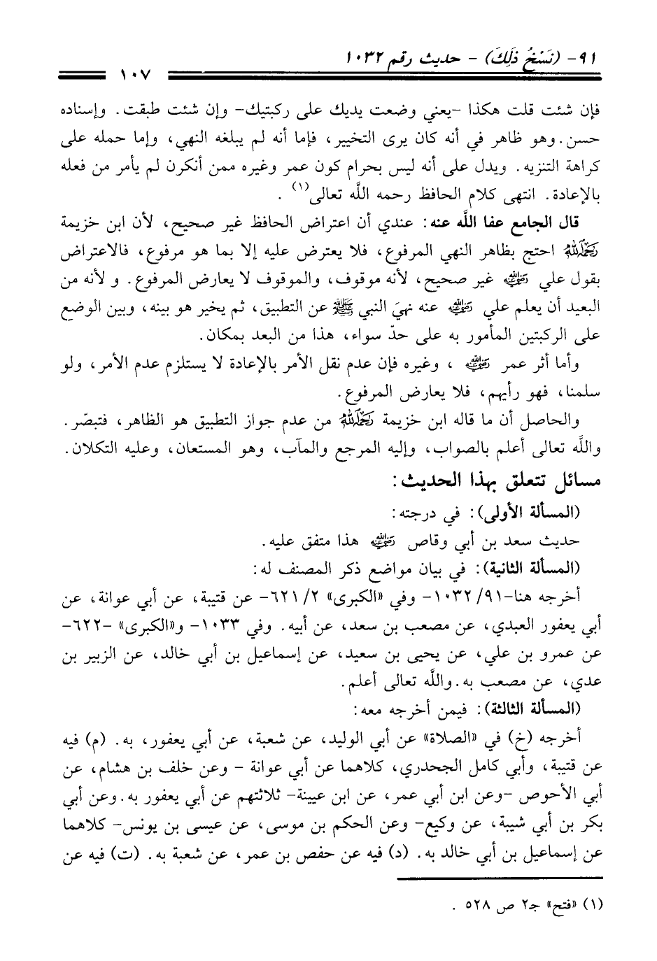 قال الجامع عفا الله عنه: عندي أن اعتراض الحافظ غير صحيح؛ لأن ابن خزيمة -رحمه الله- احتج بظاهر النهي المرفوع، فلا يعترض عليه إلا بما هو مرفوع، فالاعتراض بقوله علي - رضي الله عنه - غير صحيح؛ لأنه موقوف، والموقوف لا يعارض المرفوع. ولأنه من البعيد أن يعلم علي - رضي الله عنه - عنه نهي النبي - صلى الله عليه وسلم - عن التطبيق، ثم يخير هو بينه، وبين الوضع على الركبتين المأمور به على حدّ سواء، هذا من البعد بمكان.