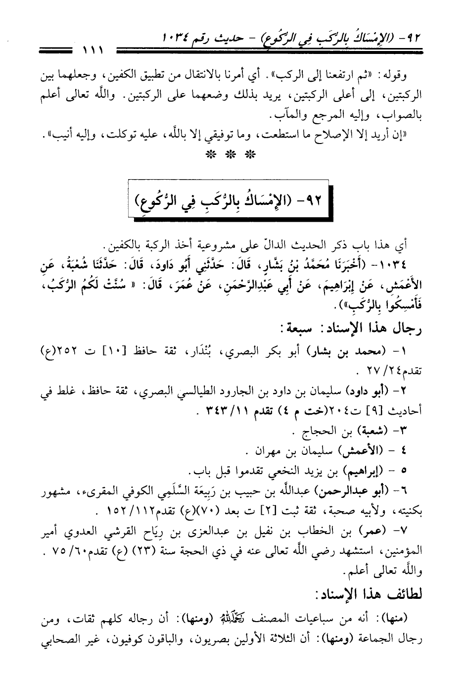 1034 - (أَخْبَرَنَا مُحَمَّدُ بْنُ بَشَّارٍ، قَالَ: حَدَّثَنِي أَبُو دَاوُدَ، قَالَ: حَدَّثَنَا شُعْبَةُ، عَنِ الأَعْمَشِ، عَنْ إِبْرَاهِيمَ، عَنْ أَبِي عَبْدِ الرَّحْمَنِ، عَنْ عُمَرَ، قَالَ: "سُنَّتْ لَكُمُ الرُّكَبُ، فَأَمْسِكُوا بِالرُّكَبِ").