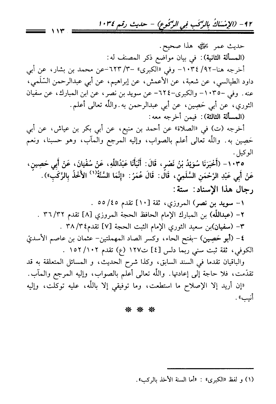 1035 - (أَخْبَرَنَا سُوَيْدُ بْنُ نَصْرٍ، قَالَ: أَنْبَأَنَا عَبْدُ اللَّهِ، عَنْ سُفْيَانَ، عَنْ أَبِي حَصِينٍ، عَنْ أَبِي عَبْدِ الرَّحْمَنِ السُّلَمِيِّ، قَالَ: قَالَ عُمَرُ: "إِنَّمَا السُّنَّةُ (¬1) الأَخْذُ بِالرُّكَبِ").