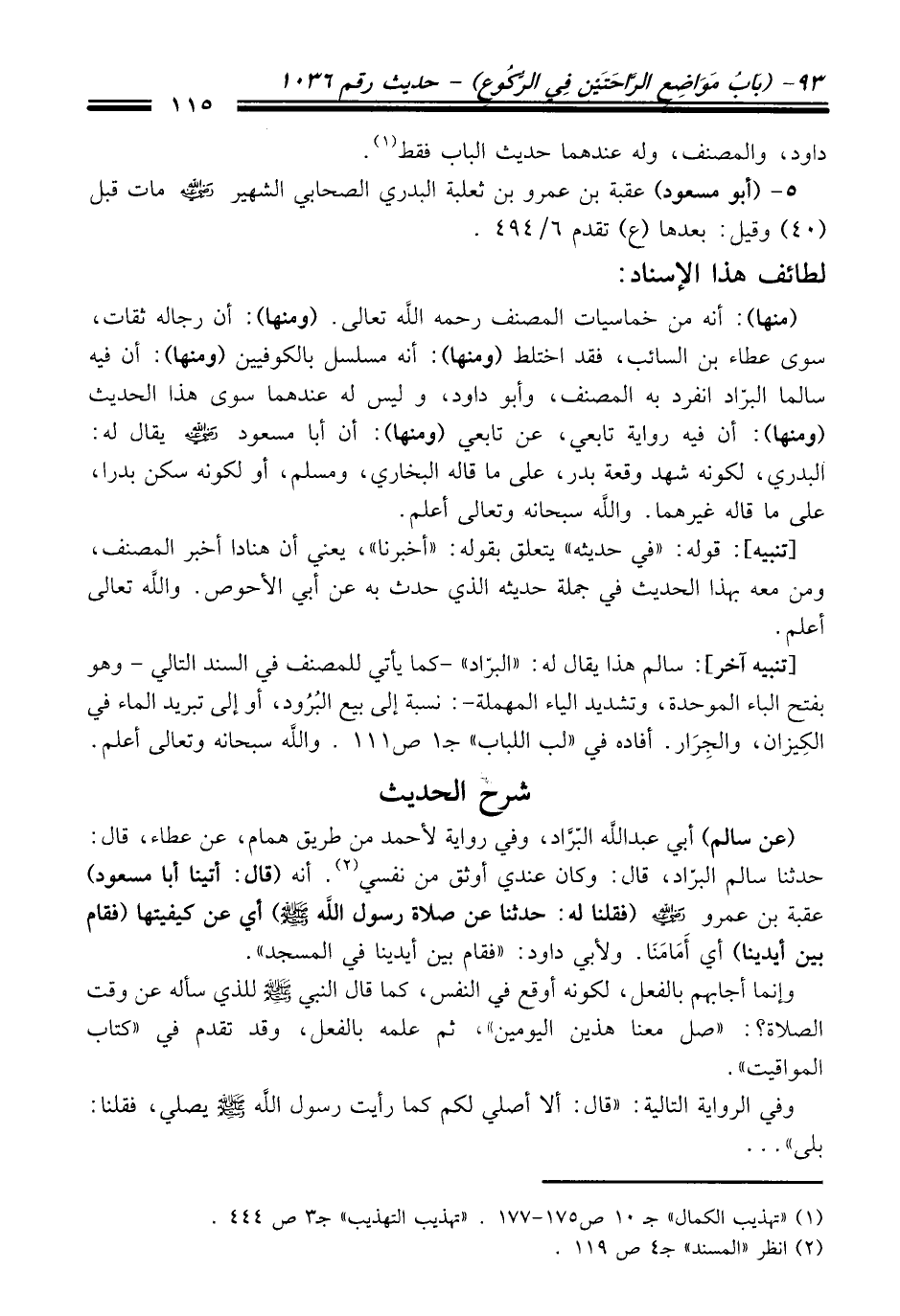 [تنبيه آخر]: سالم هذا يقال له: "البرّاد"- كما يأتي للمصنف في السند التالي -وهو بفتح الباء الموحدة، وتشديد الياء المهملة-: نسبة إلى بيِع البُرُود، أو إلى تبريد الماء في الكِيزان، والجِرَار. أفاده في "لب اللباب" جـ 1 ص 111 والله سبحانه وتعالى أعلم.