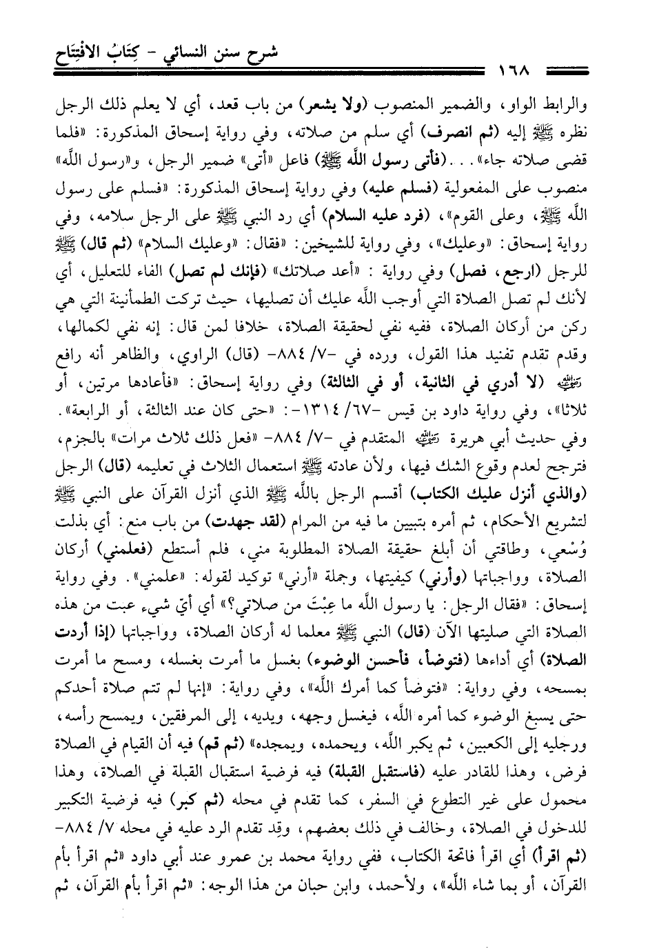 والرابط الواو، والضمير المنصوب (ولا يشعر) من باب قعد، أي لا يعلم ذلك الرجل نظره - صلى الله عليه وسلم - إليه (ثم انصرف) أي سلم من صلاته، وفي رواية إسحاق المذكورة: "فلما قضى صلاته جاء". . . (فأتى رسول الله - صلى الله عليه وسلم -) فاعل "أتى" ضمير الرجل، و"رسول الله" منصوب على المفعولية (فسلم عليه) وفي رواية إسحاق المذكورة: "فسلم على رسول الله - صلى الله عليه وسلم -، وعلى القوم"، (فرد عليه السلام) أي رد النبي - صلى الله عليه وسلم - على الرجل سلامه، وفي رواية إسحاق: "وعليك"، وفي رواية للشيخين: "فقال: "وعليك السلام" (ثم قال) - صلى الله عليه وسلم - للرجل (ارجع، فصل) وفي رواية: "أعد صلاتك" (فإنك لم تصل) الفاء للتعليل، أي لأنك لم تصل الصلاة التي أوجب الله عليك أن تصليها، حيث تركت الطمأنينة التي هي ركن من أركان الصلاة، ففيه نفي لحقيقة الصلاة، خلافا لمن قال: إنه نفي لكمالها، وقدم تقدم تفنيد هذا القول، ورده في -7/ 884 - (قال) الراوي، والظاهر أنه رافع - رضي الله عنه - (لا أدري في الثانية، أو في الثالثة) وفي رواية إسحاق: "فأعادها مرتين، أو ثلاثا"، وفي رواية داود بن قيس -67/ 1314 - : "حتى كان عند الثالثة، أو الرابعة". وفي حديث أبي هريرة - رضي الله عنه - المتقدم في -7/ 884 - "فعل ذلك ثلاث مرات" بالجزم، فترجح لعدم وقوع الشك فيها، ولأن عادته - صلى الله عليه وسلم - استعمال الثلاث في تعليمه (قال) الرجل (والذي أنزل عليك الكتاب) أقسم الرجل بالله - صلى الله عليه وسلم - الذي أنزل القرآن على النبي - صلى الله عليه وسلم - لتشريع الأحكام، ثم أمره بتبيين ما فيه من المرام (لقد جهدت) من باب منع: أي بذلت وُسْعي، وطاقتي أن أبلغ حقيقة الصلاة المطلوبة مني، فلم أستطع (فعلمني) أركان الصلاة، وواجباتها (وأرني) كيفيتها، وجملة "أرني" توكيد لقوله؛ "علمني". وفي رواية إسحاق: "فقال الرجل: يا رسول الله ما عِبْتَ من صلاتي؟ " أي أيّ شيء عبت من هذه الصلاة التي صليتها الآن (قال) النبي - صلى الله عليه وسلم - معلما له أركان الصلاة، وواجباتها (إذا أردت الصلاة) أي أداءها (فتوضأ، فأحسن الوضوء) بغسل ما أمرت بغسله، ومسح ما أمرت بمسحه، وفي رواية: "فتوضأ كما أمرك الله"، وفي رواية: "إنها لم تتم صلاة أحدكم حتى يسبغ الوضوء كما أمره الله، فيغسل وجهه، ويديه، إلى المرفقين، ويمسح رأسه، ورجليه إلى الكعبين، ثم يكبر الله، ويحمده، ويمجده" (ثم قم) فيه أن القيام في الصلاة فرض، وهذا للقادر عليه (فاستقبل القبلة) فيه فرضية استقبال القبلة في الصلاة، وهذا محمول على غير التطوع في السفر، كما تقدم في محله (ثم كبر) فيه فرضية التكبير للدخول في الصلاة، وخالف في ذلك بحضهم، وقِد تقدم الرد عليه في محله 7/ 884 - (ثم اقرأ) أي اقرأ فاتحة الكتاب، ففي رواية محمَّد بن عمرو عند أبي داود "ثم اقرأ بأم القرآن، أو بما شاء الله"، ولأحمد، وابن حبان من هذا الوجه: "ثم اقرأ بأم القرآن، ثم