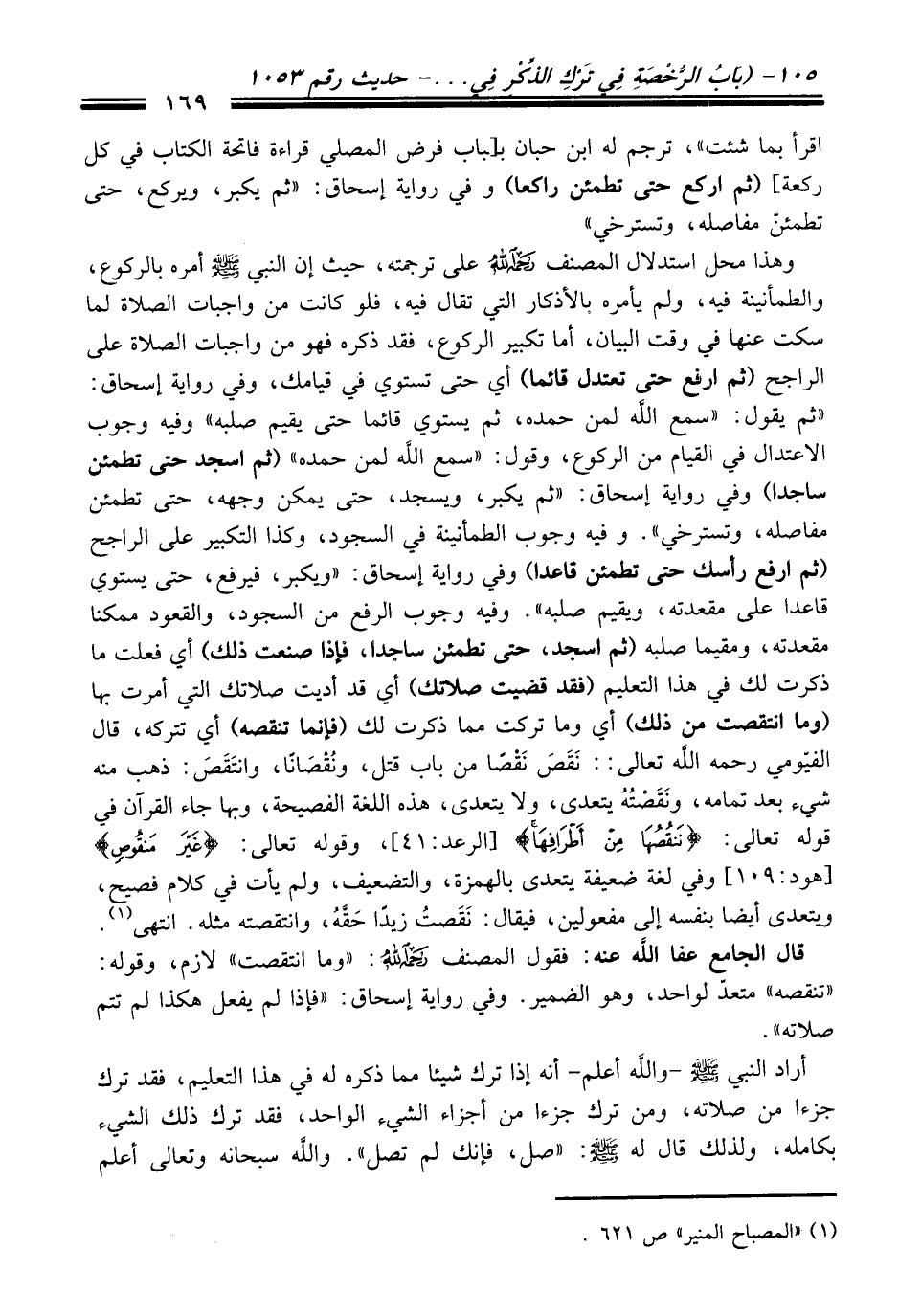 اقرأ بما شئت"، ترجم له ابن حبان بـ[باب فرض المصلي قراءة فاتحة الكتاب في كل ركعة] (ثم اركع حتى تطمئن راكعا) وفي رواية إسحاق: "ثم يكبر، ويركع، حتى تطمئنّ مفاصله، وتسترخي".