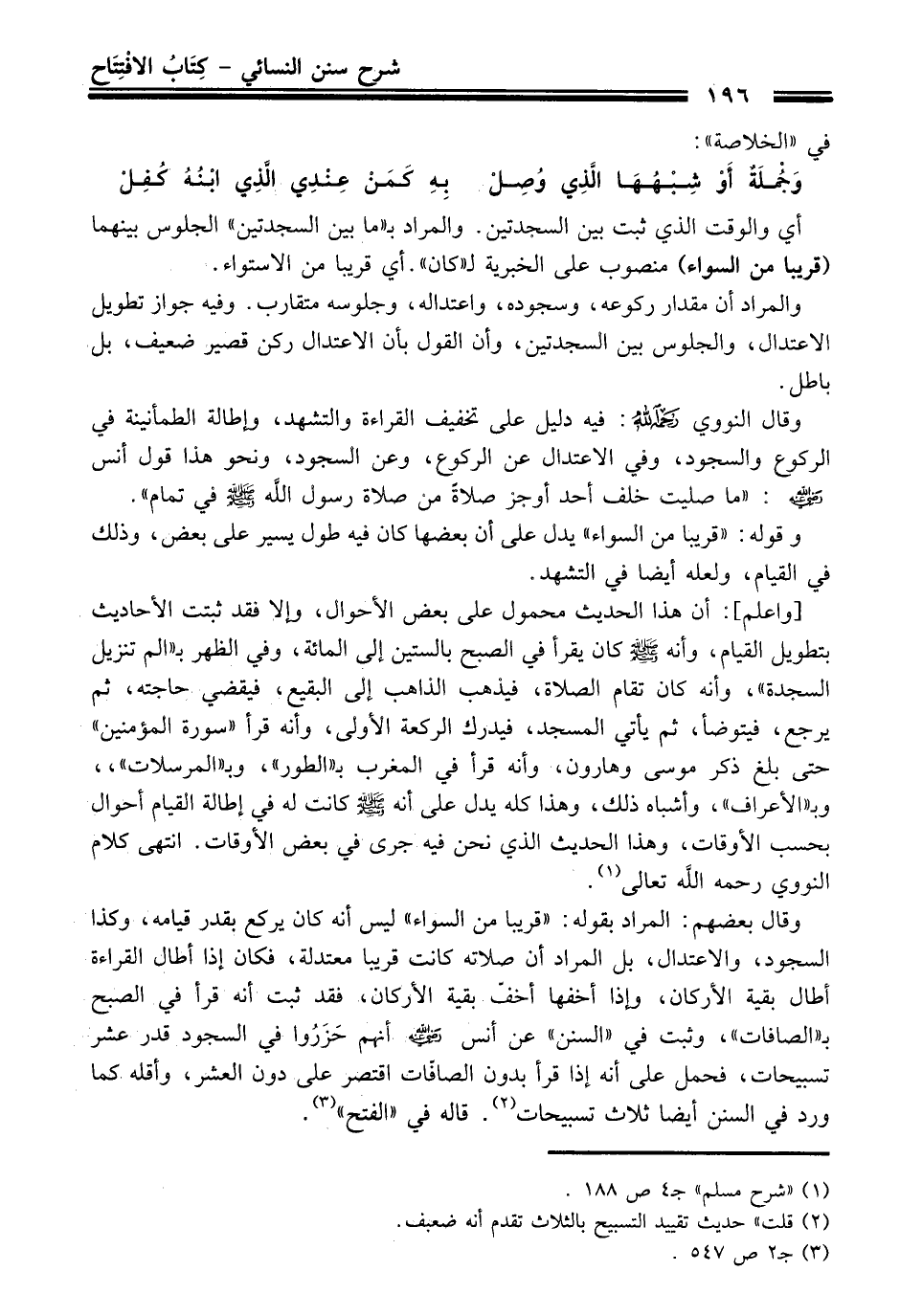 وقال بعضهم: المراد بقوله: "قريبا من السواء" ليس أنه كان يركع بقدر قيامه، وكذا السجود، والاعتدال، بل المراد أن صلاته كانت قريبا معتدلة، فكان إذا أطال القراءة أطال بقية الأركان، وإذا أخفها أخفّ بقية الأركان، فقد ثبت أنه قرأ في الصبح بـ"الصافات"، وثبت في "السنن" عن أنس - رضي الله عنه - أنهم حَزَرُوا في السجود قدر عشر تسبيحات، فحمل على أنه إذا قرأ بدون الصافات اقتصر على دون العشر، وأقله كما ورد في السنن أيضًا ثلاث تسبيحات (¬2). قاله في "الفتح" (¬3).