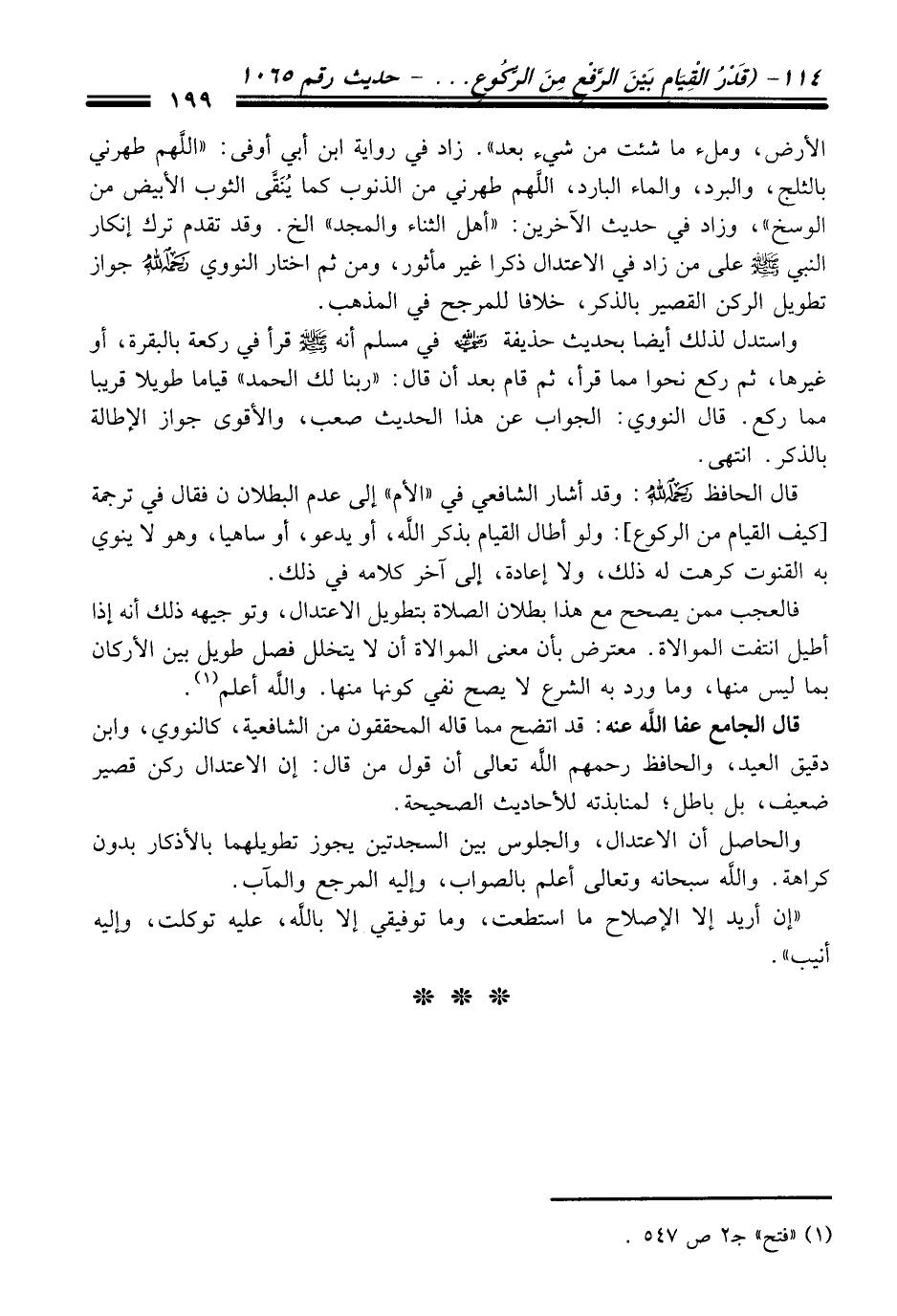 قال الجامع عفا الله عنه: قد اتضح مما قاله المحققون من الشافعية، كالنووي، وابن دقيق العيد، والحافظ رحمهم الله تعالى أن قول من قال: إن الاعتدال ركن قصير ضعيف، بل باطل؛ لمنابذته للأحاديث الصحيحة.