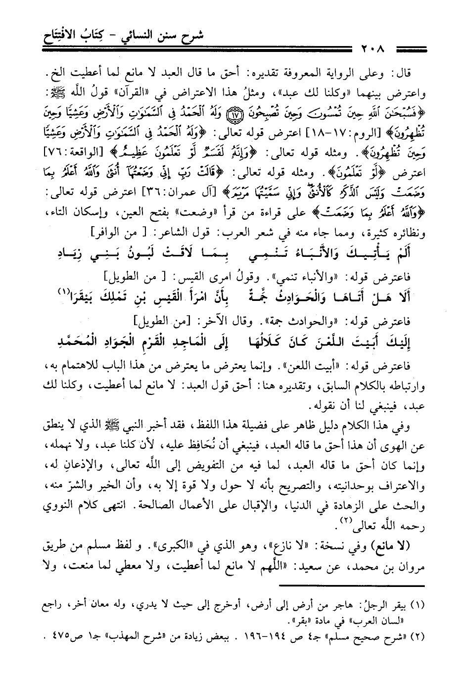 قال: وعلى الرواية المعروفة تقديره: أحق ما قال العبد لا مانع لما أعطيت الخ. واعترض بينهما "وكلنا لك عبد"، ومثلُ هذا الاعتراض في "القرآن" قولُ الله - صلى الله عليه وسلم -: {فَسُبْحَانَ اللَّهِ حِينَ تُمْسُونَ وَحِينَ تُصْبِحُونَ (17) وَلَهُ الْحَمْدُ فِي السَّمَاوَاتِ وَالْأَرْضِ وَعَشِيًّا وَحِينَ تُظْهِرُونَ} [الروم: 17 - 18] اعترض قوله تعالى: {وَلَهُ الْحَمْدُ فِي السَّمَاوَاتِ وَالْأَرْضِ وَعَشِيًّا وَحِينَ تُظْهِرُونَ}. ومثله قوله تعالى: {وَإِنَّهُ لَقَسَمٌ لَوْ تَعْلَمُونَ عَظِيمٌ (76)} [الواقعة:76] اعترض {لَوْ تَعْلَمُونَ}. ومثله قوله تعالى: {قَالَتْ رَبِّ إِنِّي وَضَعْتُهَا أُنْثَى وَاللَّهُ أَعْلَمُ بِمَا وَضَعَتْ وَلَيْسَ الذَّكَرُ كَالْأُنْثَى وَإِنِّي سَمَّيْتُهَا مَرْيَمَ} [آل عمران: 36] اعترض قوله تعالى: {وَاللَّهُ أَعْلَمُ بِمَا وَضَعَتْ} على قراءة من قرأ "وضعت" بفتح العين، وإسكان التاء، ونظائره كثيرة، ومما جاء منه في شعر العرب: قول الشاعر: [من الوافر]
