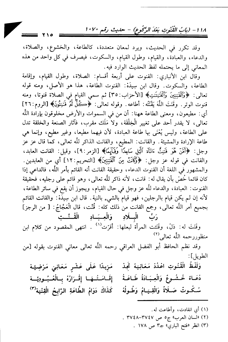 وقد نظم الحافظ أبو الفضل العراقي رحمه الله تعالى معاني القنوت بقوله [من الطويل]: