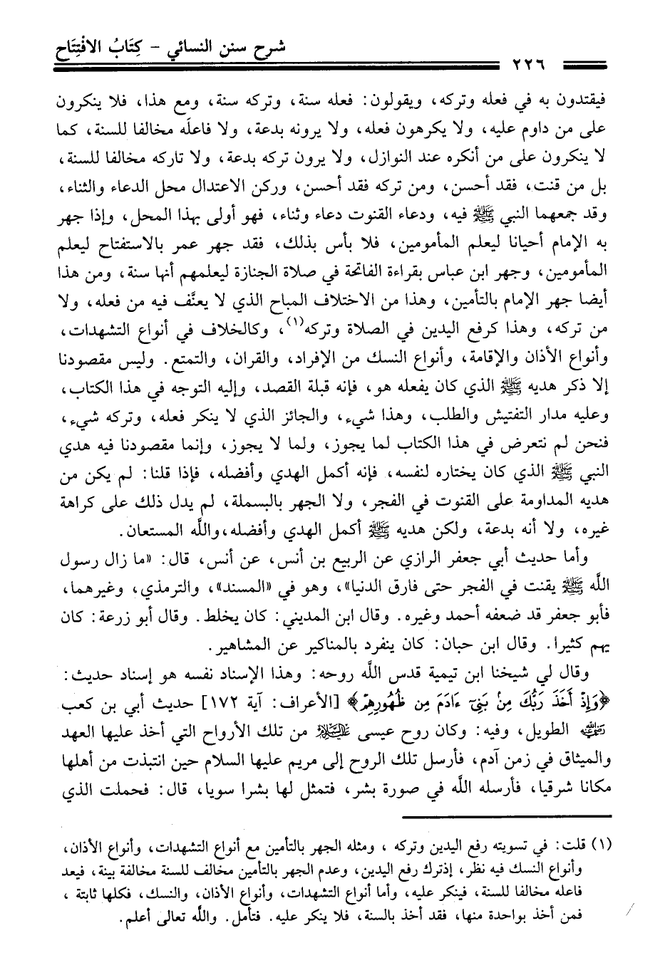 (¬1) قلت: في تسويته رفع اليدين وتركه، ومثله الجهر بالتأمين مع أنواع التشهدات، وأنواع الأذان، وأنواع النسك فيه نظر، إذ ترك رفع اليدين، وعدم الجهر بالتأمين مخالف للسنة مخالفة بينة، فيعد فاعله مخالفا للسنة، فينكر عليه، وأما أنواع التشهدات، وأنواع الأذان، والنسك، فكلها ثابتة، فمن أخذ بواحدة منها، فقد أخذ بالسنة، فلا ينكر عليه. فتأمل. والله تعالى أعلم.