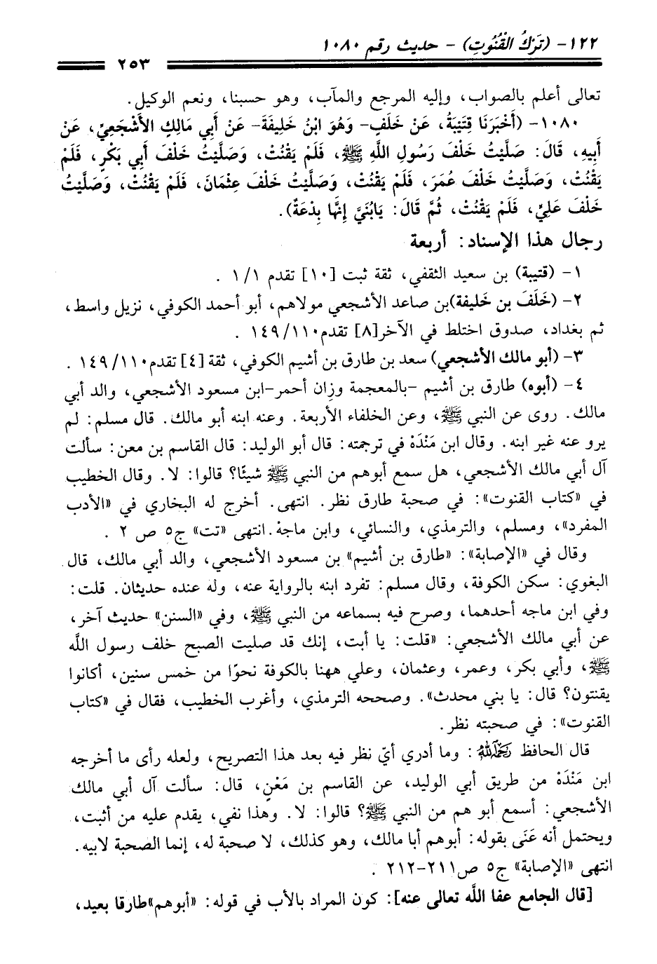 وقال في "الإصابة": "طارق بن أشيم" بن مسعود الأشجعي، والد أبي مالك، قال البغوي: سكن الكوفة، وقال مسلم: تفرد ابنه بالرواية عنه، وله عنده حديثان. قلت: وفي ابن ماجه أحدهما، وصرح فيه بسماعه من النبي - صلى الله عليه وسلم -، وفي "السنن" حديث آخر، عن أبي مالك الأشجعي: "قلت: يا أبت، إنك قد صليت الصبح خلف رسول الله - صلى الله عليه وسلم -، وأبي بكر، وعمر، وعثمان، وعلي ها هنا بالكوفة نحوًا من خمس سنين، أكانوا يقنتون؟ قال؛ يا بني محدث". وصححه الترمذي، وأغرب الخطيب، فقال في "كتاب القنوت": في صحبته نظر.