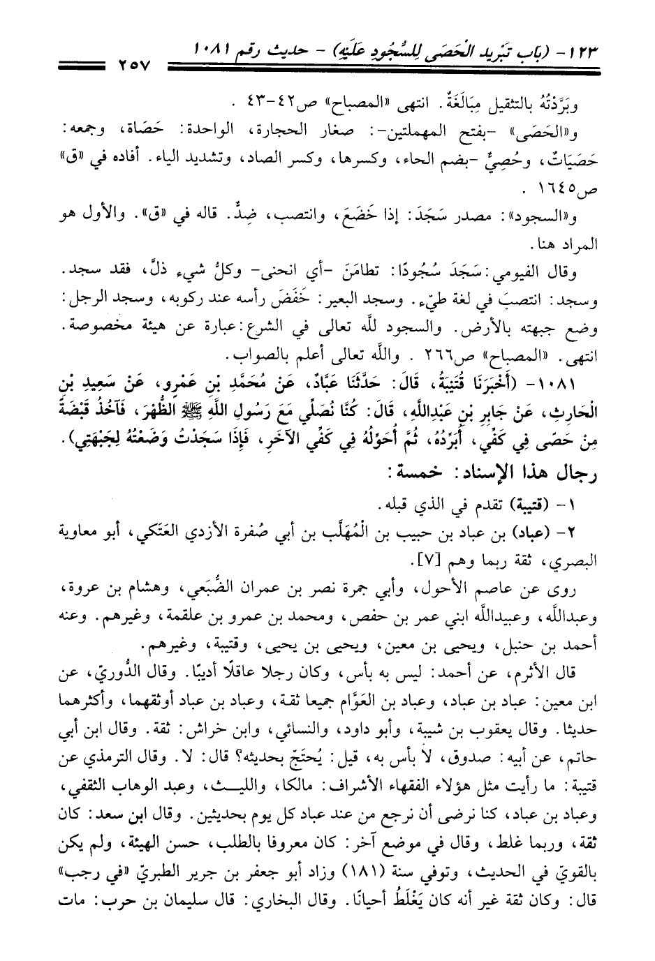 1081 - (أَخْبَرَنَا قُتَيْبَةُ، قَالَ: حَدَّثَنَا عَبَّادٌ، عَنْ مُحَمَّدِ بْنِ عَمْرٍو، عَنْ سَعِيدِ بْنِ الْحَارِثِ، عَنْ جَابِرِ بْنِ عَبْدِ اللَّهِ، قَالَ: كُنَّا نُصَلِّي مَعَ رَسُولِ اللَّهِ - صلى الله عليه وسلم - الظُّهْرَ، فَآخُذُ قَبْضَةً مِنْ حَصًى فِي كَفِّي، أُبَرِّدُهُ، ثُمَّ أُحَوِّلُهُ فِي كَفِّي الآخَرِ، فَإِذَا سَجَدْتُ وَضَعْتُهُ لِجَبْهَتِي).