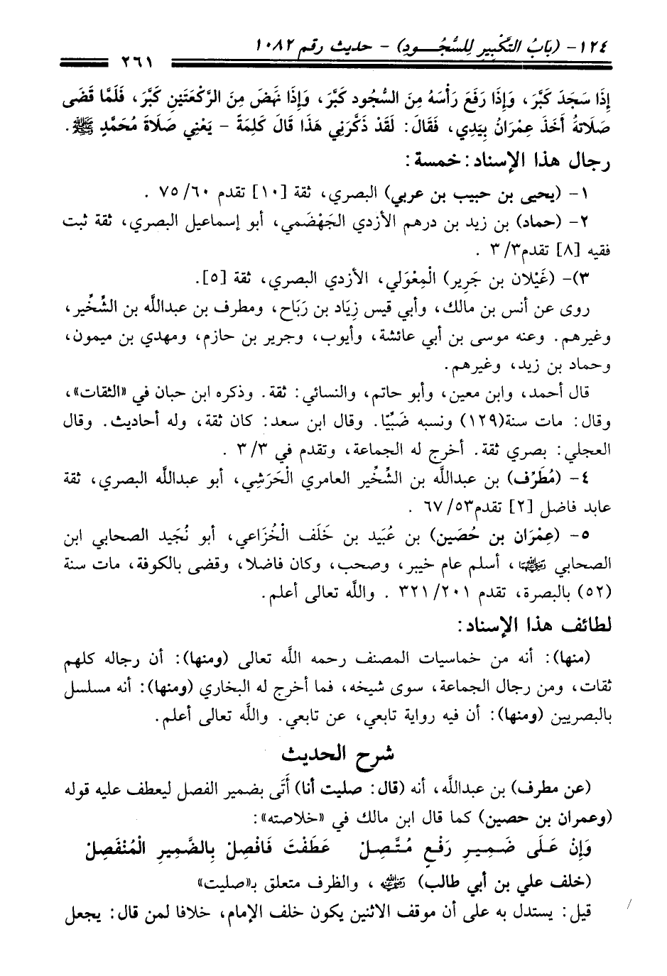 إِذَا سَجَدَ كَبَّرَ، وَإِذَا رَفَعَ رَأْسَهُ مِنَ السُّجُودِ كَبَّرَ، وَإِذَا نَهَضَ مِنَ الرَّكْعَتَيْنِ كَبَّرَ، فَلَمَّا قَضَى صَلاَتَهُ أَخَذَ عِمْرَانُ بِيَدِي، فَقَالَ: لَقَدْ ذَكَّرَنِي هَذَا قَالَ كَلِمَةً -يَعْنِي صَلاَةَ مُحَمَّد - صلى الله عليه وسلم -).