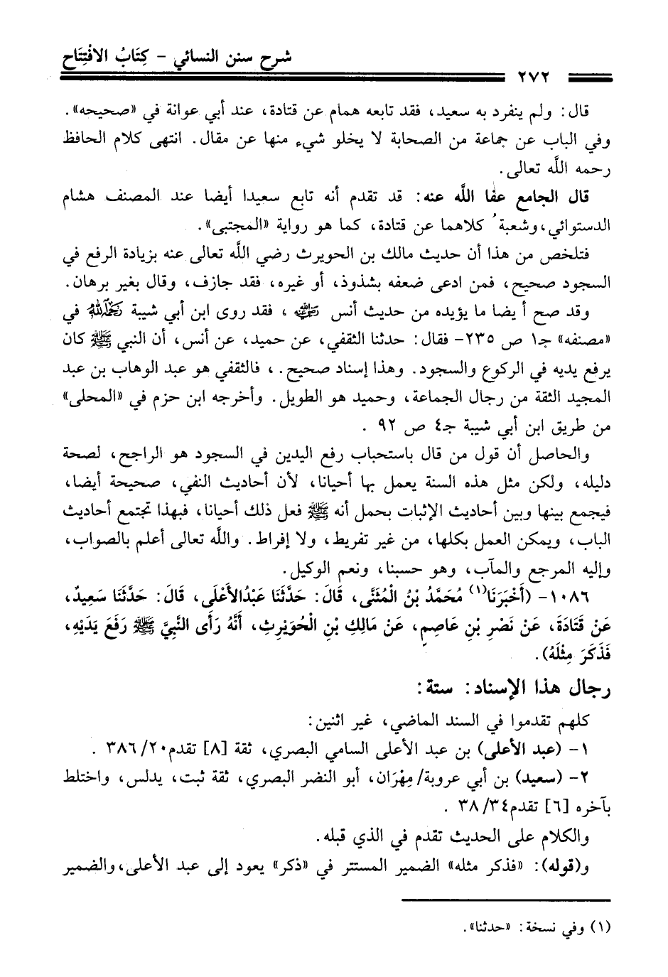 1086 - (أَخْبَرَنَا (¬1) مُحَمَّدُ بْنُ الْمُثَنَّى، قَالَ: حَدَّثَنَا عَبْدُ الأَعْلَى، قَالَ: حَدَّثَنَا سَعِيدٌ، عَنْ قَتَادَةَ، عَنْ نَصْرِ بْنِ عَاصِمٍ، عَنْ مَالِكِ بْنِ الْحُوَيْرِثِ، أَنَّهُ رَأَى النَّبِيَّ - صلى الله عليه وسلم - رَفَعَ يَدَيْهِ فَذَكَرَ مِثْلَهُ).