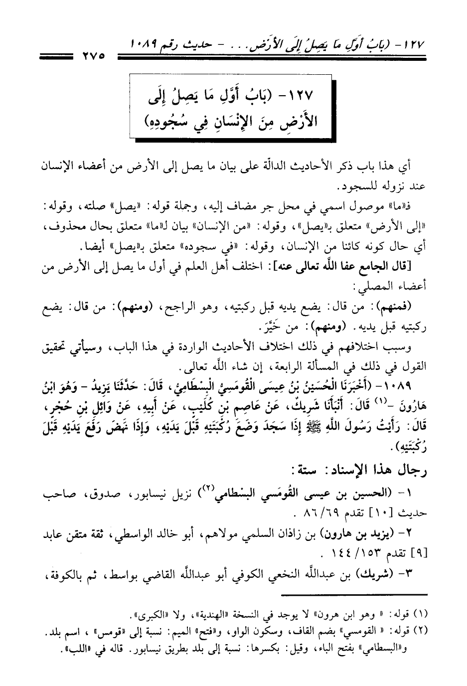 1089 - (أَخْبَرَنَا الْحُسَيْنُ بْنُ عِيسَى الْقُومَسِيُّ الْبَسْطَامِيُّ، قَالَ: حَدَّثَنَا يَزِيدُ -وَهُوَ ابْنُ هَارُونَ- (¬1) قَالَ: أَنْبَأَنَا شَرِيكٌ، عَنْ عَاصِمِ بْنِ كُلَيْبٍ، عَنْ أَبِيهِ، عَنْ وَائِلِ بْنِ حُجْرٍ، قَالَ: رَأَيْتُ رَسُولَ اللَّهِ - صلى الله عليه وسلم - إِذَا سَجَدَ وَضَعَ رُكْبَتَيْهِ قَبْلَ يَدَيْهِ، وَإِذَا نَهَضَ رَفَعَ يَدَيْهِ قَبْلَ رُكْبَتَيْهِ).