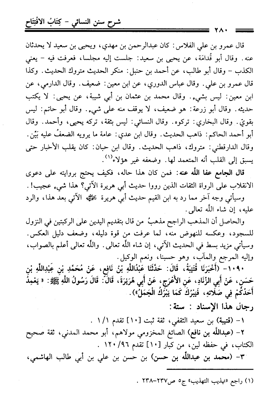 1090 - (أَخْبَرَنَا قُتَيْبَةُ، قَالَ: حَدَّثَنَا عَبْدُ اللَّهِ بْنُ نَافِعٍ، عَنْ مُحَمَّدِ بْنِ عَبْدِ اللَّهِ بْنِ حَسَنٍ، عَنْ أَبِي الزِّنَادِ، عَنِ الأَعْرَجِ، عَنْ أَبِي هُرَيْرَةَ، قَالَ: قَالَ رَسُولُ اللَّهِ - صلى الله عليه وسلم -: "يَعْمِدُ أَحَدُكُمْ فِي صَلاَتِهِ، فَيَبْرُكَ كَمَا يَبْرُكُ الْجَمَلُ").