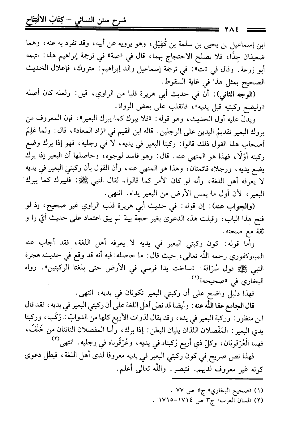 وأما قوله: كون ركبتي البعير في يديه لا يعرفه أهل اللغة، فقد أجاب عنه المباركفوري رحمه الله تعالى، حيث قال: ما حاصله: فيه أنه قد وقع في حديث هجرة النبي - صلى الله عليه وسلم - قول سُرَاقة: "ساخت يدا فرسي في الأرض حتى بلغتا الركبتين". رواه البخاري في "صحيحه" (¬1)