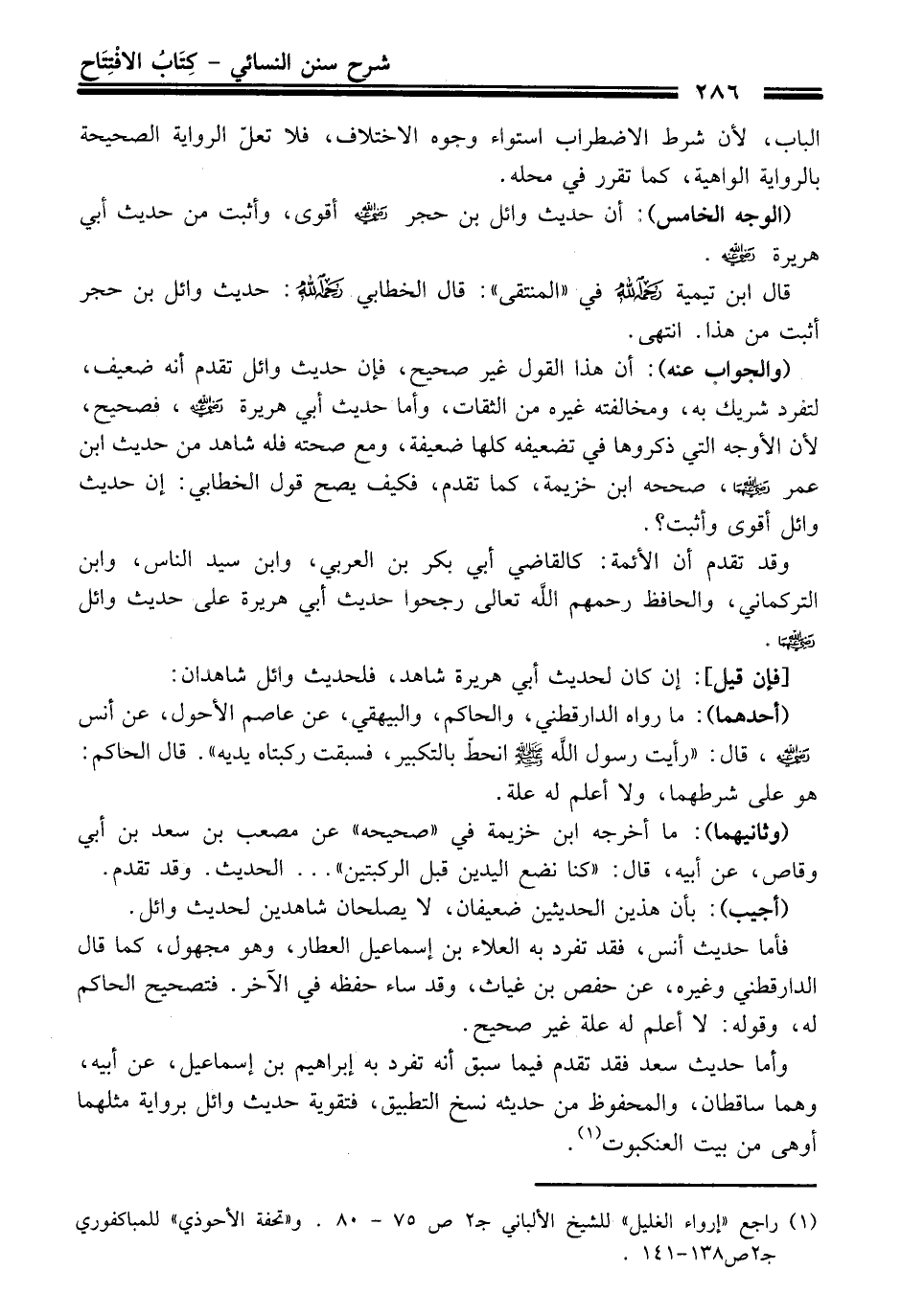(والجواب عنه): أن هذا القول غير صحيح، فإن حديث وائل تقدم أنه ضعيف، لتفرد شريح به، ومخالفته غيره من الثقات، وأما حديث؛ أبي هريرة - رضي الله عنه -، فصحيح، لأن الأوجه التي ذكروها في تضعيفه كلها ضعيفة، ومع صحته فله شاهد من حديث ابن عمر - رضي الله عنهما -، صححه ابن خزيمة، كما تقدم، فكيف يصح قوله الخطابي: إن حديث وائل أقوى وأثبت؟.
