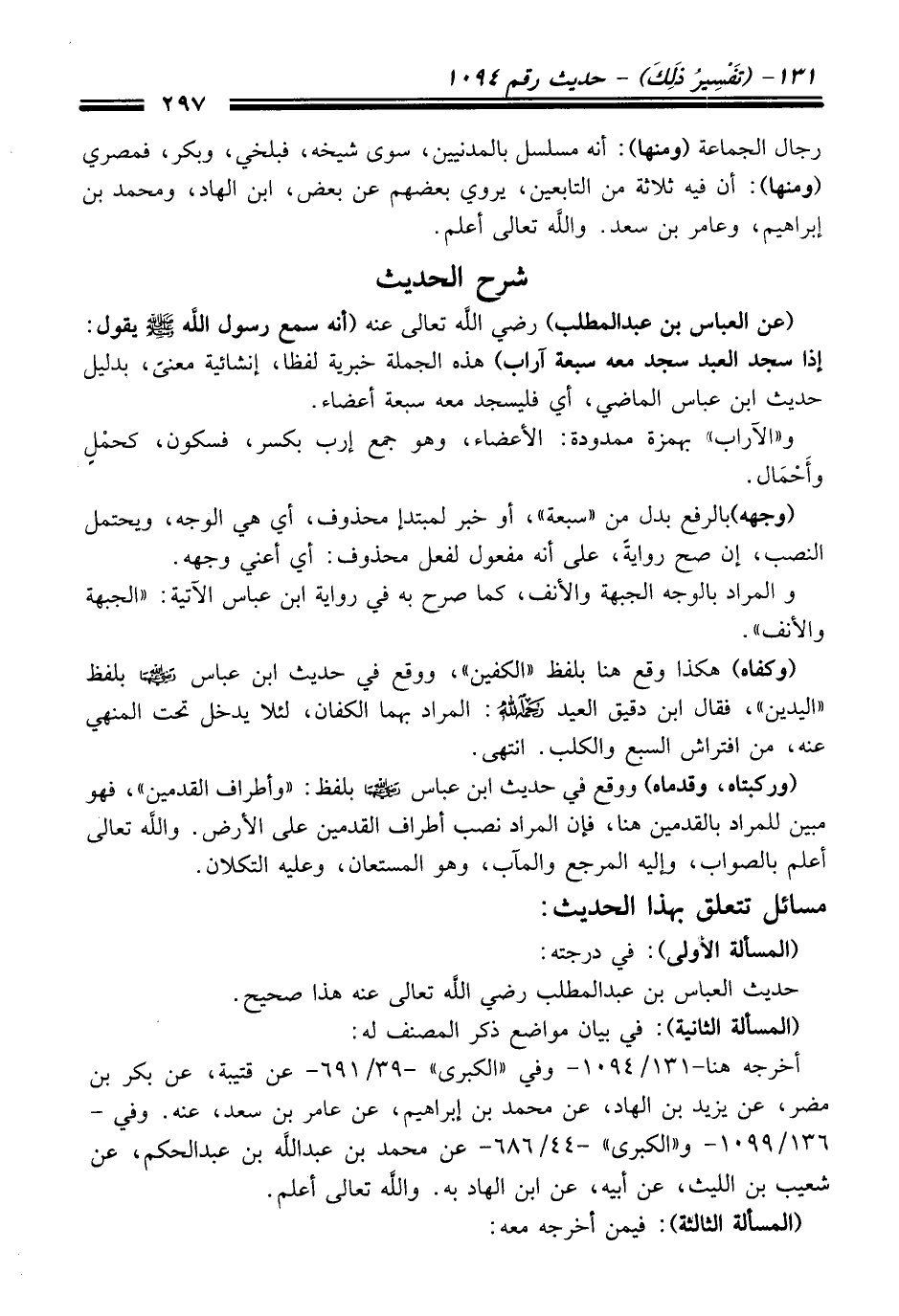(عن العباس بن عبد المطلب) رضي الله تعالى عنه (أنه سمع رسول الله - صلى الله عليه وسلم - يقول: إذا سجد العبد سجد معه سبعة آراب) هذه الجملة خبرية لفظا، إنشائية معنىّ، بدليل حديث ابن عباس الماضي، أي فليسجد معه سبعة أعضاء.