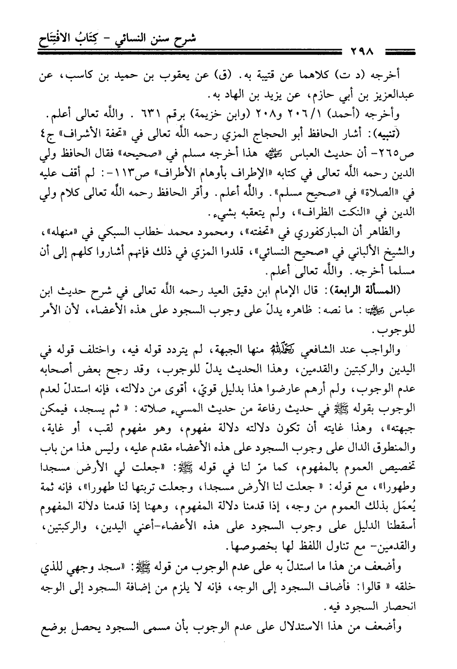 (المسألة الرابعة): قال الإمام ابن دقيق العيد رحمه الله تعالى في شرح حديث ابن عباس - رضي الله عنهما -: ما نصّه: ظاهره يدلّ على وجوب السجود على هذه الأعضاء؛ لأن الأمر للوجوب.