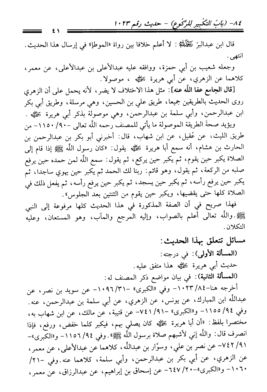أخرجه هنا -84/ 1023 - وفي "الكبرى" -31/ 1096 - عن سويد بن نصر، عن عبد الله ابن المبارك، عن يونس، عن الزهري، عن أبي سلمة بن عبد الرحمن، عنه. وفي 94/ 1155 - و"الكبرى" 91/ 741 - عن قتيبة، عن مالك، عن ابن شهاب به، مختصرا بلفظ: "أن أبا هريرة - رضي الله عنه - كان يصلي بهم، فيكبر كلما خفض، ورفع، فإذا انصرف قال: والله إني لأشبهم صلاة برسول الله - صلى الله عليه وسلم -". وفي 94/ 1156 - و"الكبرى" -91/ 742 - عن نصر بن علي، وسوَّار بن عبد الله، كلاهما عن عبد الأعلى، عن معمر، عن الزهري، عن أبي بكر بن عبد الرحمن، وأبي سلمة، كلاهما عنه. وفي -21/ 1060 - و"الكبرى" -20/ 647 - عن إسحاق بن إبراهيم، عن عبد الرزاق، عن معمر،
