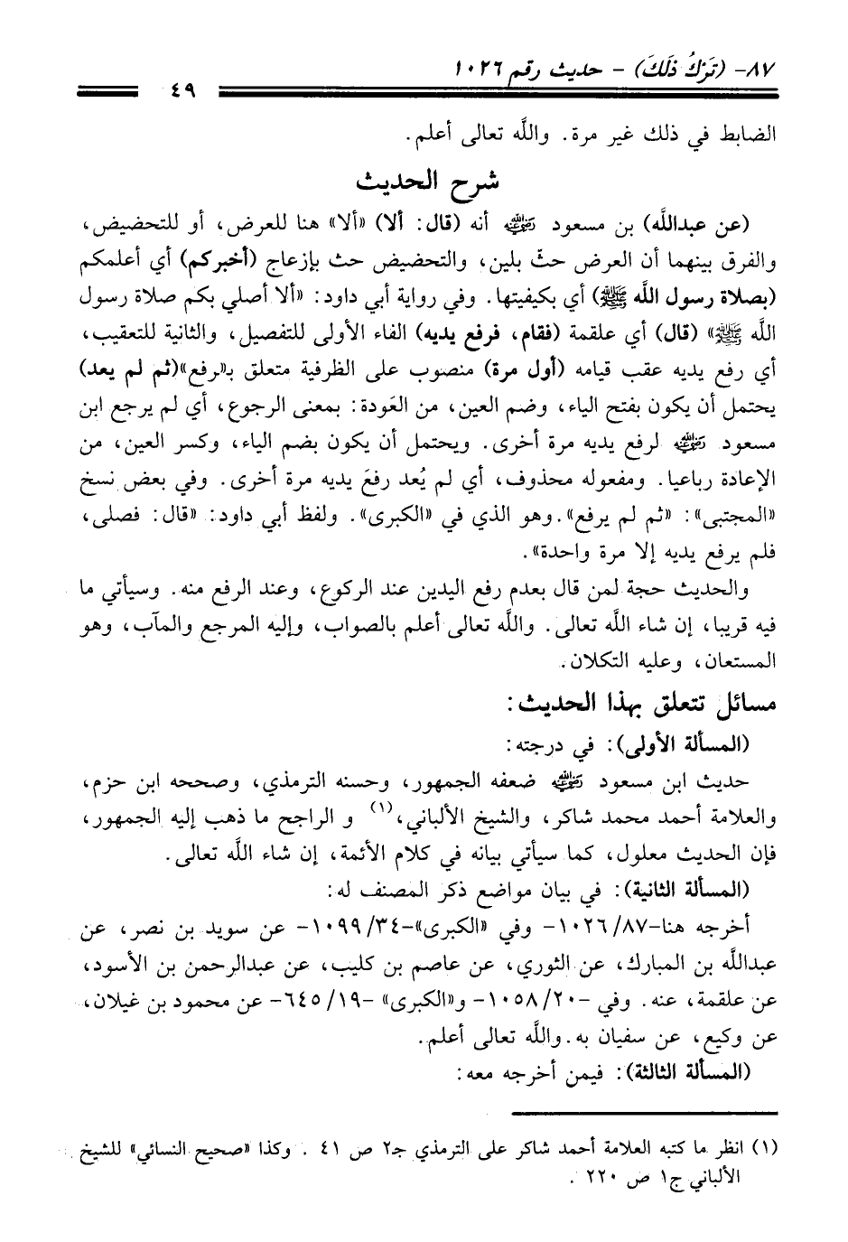 (¬1) انظر ما كتبه العلامة أحمد شاكر على الترمذي جـ 2 ص41. وكذا "صحيح النسائي" للشيخ الألباني جـ 1 ص 220.
