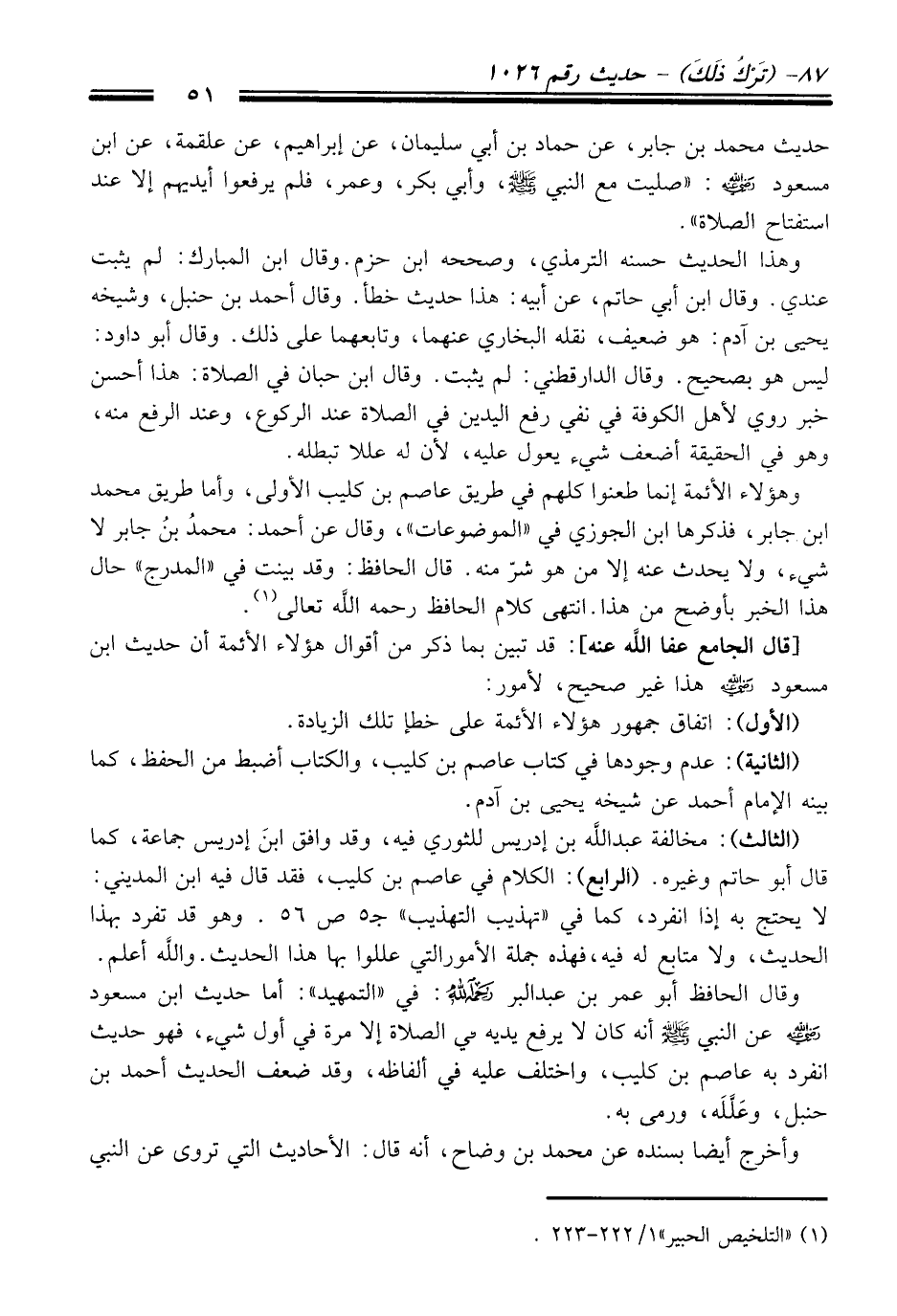حديث محمَّد بن جابر، عن حماد بن أبي سليمان، عن إبراهيم، عن علقمة، عن ابن مسعود - رضي الله عنه -: "صليت مع النبي - صلى الله عليه وسلم -، وأبي بكر، وعمر، فلم يرفعوا أيديهم إلا عند استفتاح الصلاة".