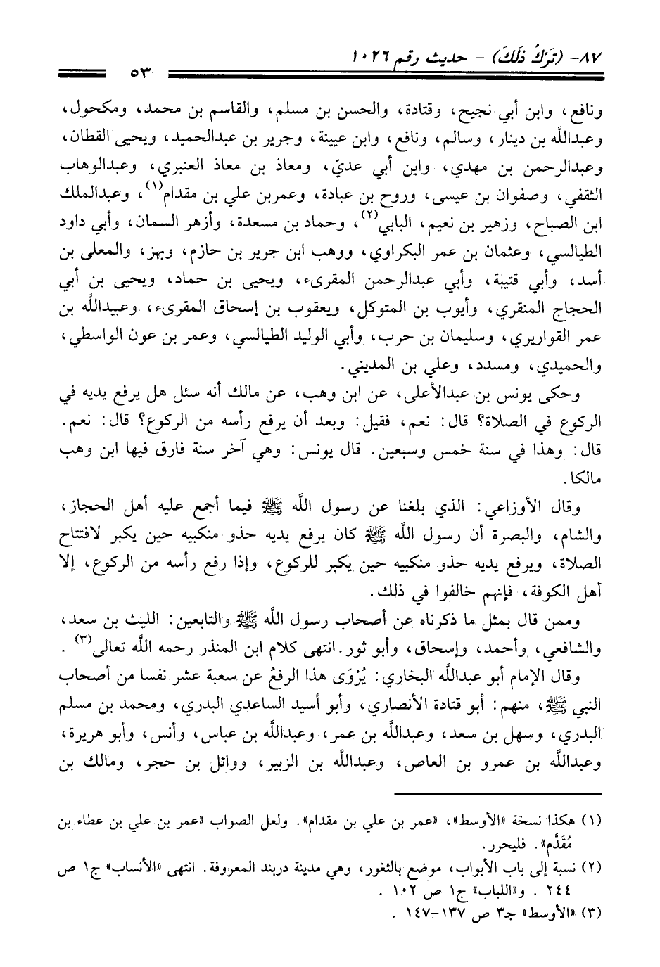 وقال الأوزاعي: الذي بلغنا عن رسول الله - صلى الله عليه وسلم - فيما عليه أهل الحجاز، والشام، والبصرة أن رسول الله - صلى الله عليه وسلم - كان يرفع يديه حذو منكبيه حين يكبر لافتتاح الصلاة، ويرفع يديه حذو منكبيه حين يكبر للركوع، وإذا رفع رأسه من الركوع، إلا أهل الكوفة، فإنهم خالفوا في ذلك.