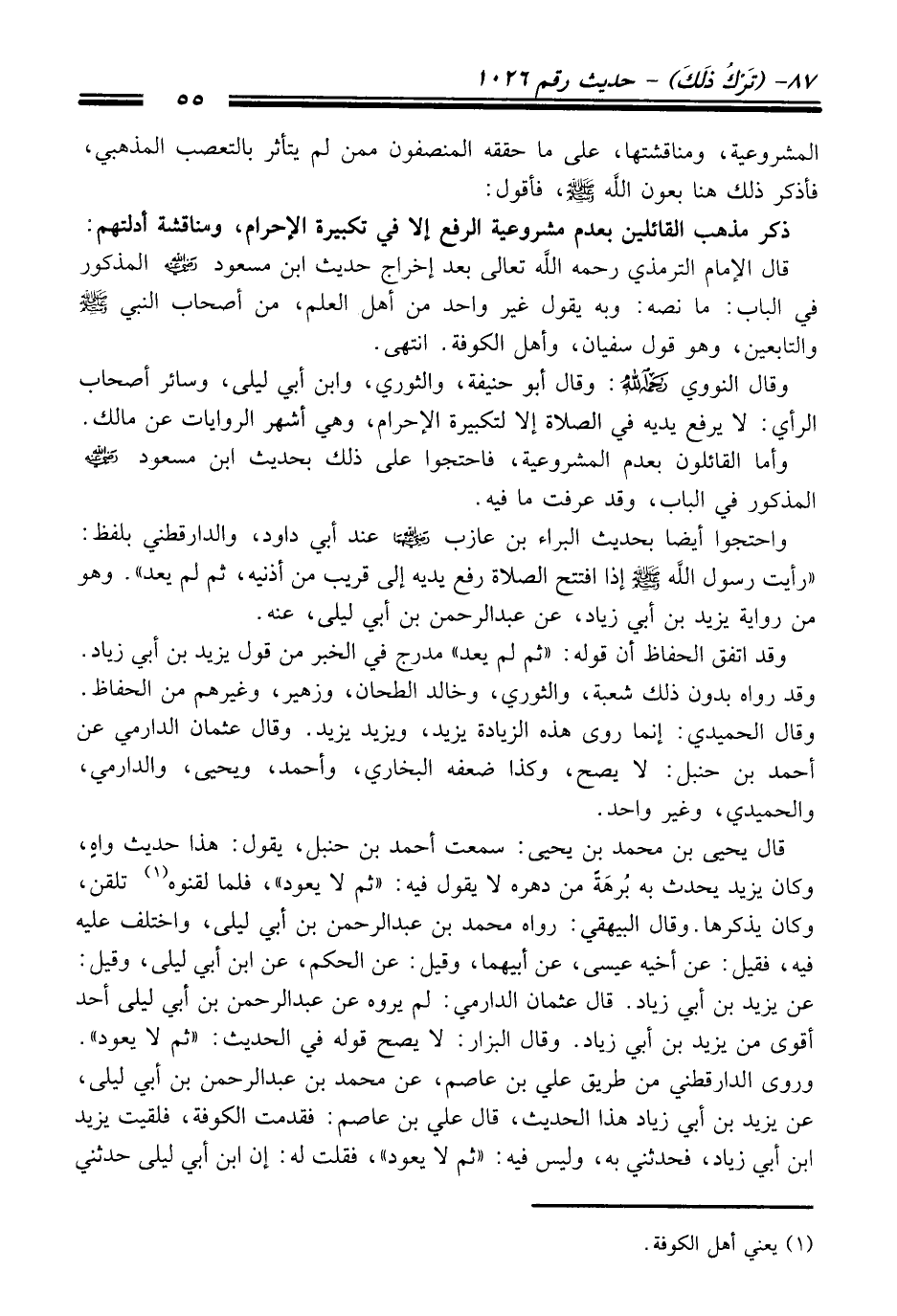 وقد اتفق الحفاظ أن قوله: "ثم لم يعد" مدرج في الخبر من قول يزيد بن أبي زياد. وقد رواه بدون ذلك شعبة، والثوري، وخالد الطحان، وزهير، وغيرهم من الحفاظ. وقال الحميدي: إنما روى هذه الزيادة يزيد، ويزيد يزيد. وقال عثمان الدارمي عن أحمد بن حنبل: لا يصح، وكذا ضعفه البخاري، وأحمد، ويحيى، والدارمي، والحميدي، وغير واحد.