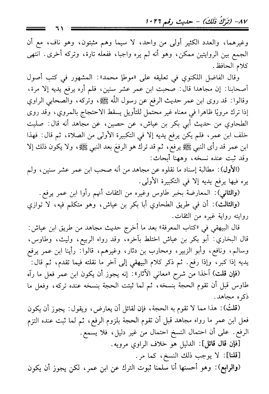 وقال الفاضل اللكنوي في تعليقه على "موطإ محمَّد": المشهور في كتب أصول أصحابنا: إن مجاهدا قال: صحبت ابن عمر عشر سنين، فلم أره يرفع يديه إلا مرة، وقالوا: قد روى ابن عمر حديث الرفع عن رسول الله - صلى الله عليه وسلم -، وتركه، والصحابي الراوي إذا ترك مرويّا ظاهرا في معناه غير محتمل للتأويل يسقط الاحتجاج بالمروي، وقد روى الطحاوي من حديث أبي بكر بن عياش، عن حصين، عن مجاهد أنه قال: صليت خلف ابن عمر، فلم يكن يرفع يديه إلا في التكبيرة الأولى من الصلاة، ثم قال: فهذا ابن عمر قد رأى النبي - صلى الله عليه وسلم - يرفع، ثم قد ترك هو الرفعَ بعد النبي - صلى الله عليه وسلم -، ولا يكون ذلك إلا وقد ثبت عنده نسخه، وها هنا أبحاث: