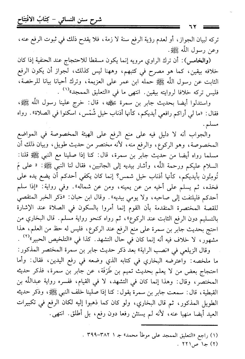 وقال الزيلعي في "نصب الراية" بعد ذكر حديث جابر بن سمرة المختصر المذكور: ما ملخصه: واعترضه البخاري في كتابه الذي وضعه في رفع اليدين، فقال: وأما احتجاج بعض من لا يعلم بحديث تميم بن طَرَفَة، عن جابر بن سمرة، فذكر حديثه المختصر، وقال: وهذا إنما كان في التشهد، لا في القيام، ففسره رواية عبد الله بن القبطية، قال: سمعت جابر بن سمرة يقول: كنا إذا صلينا خلف النبي - صلى الله عليه وسلم -، وذكر حديثه الطويل المذكور، ثم قال البخاري، ولو كان كما ذهبوا إليه لكان الرفع في تكبيرات العيد أيضا منهيا عنه؛ لأنه لم يستثن رفعا دون رفع، بل أطلق. انتهى.