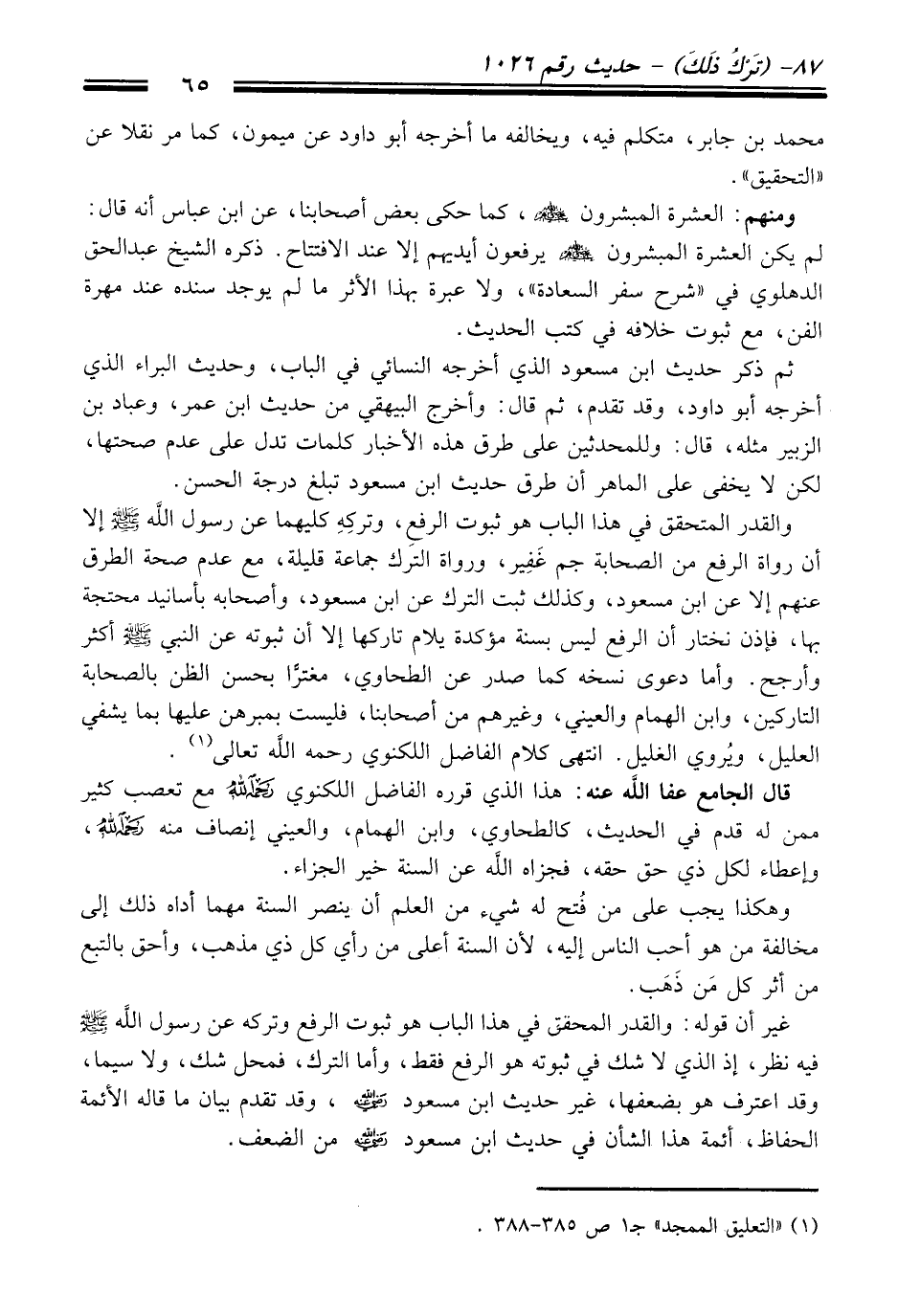 قال الجامع عفا الله عنه: هذا الذي قرره الفاضل اللكنوي -رحمه الله- مع تعصب كثير ممن له قدم في الحديث، كالطحاوي، وابن الهمام، والعيني إنصاف منه -رحمه الله-، وإعطاء لكل ذي حق حقه، فجزاه الله عن السنة خير الجزاء.