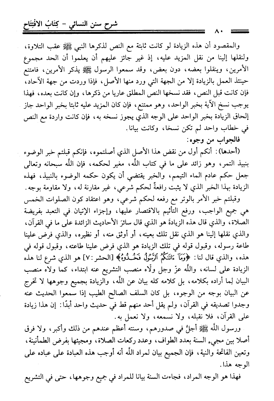 وقبلتم خبر الأمر بالوتر مع رفعه لحكم شرعي، وهو اعتقاد كون الصلوات الخمس هي جميع الواجب، ورفع التأثيم بالاقتصار عليها، وإجزاء الإتيان في التعبد بفريضة الصلاة، والذي قال هذه الزيادةَ هو الذي قال سائرَ الأحاديث الزائدة على ما في القرآن،