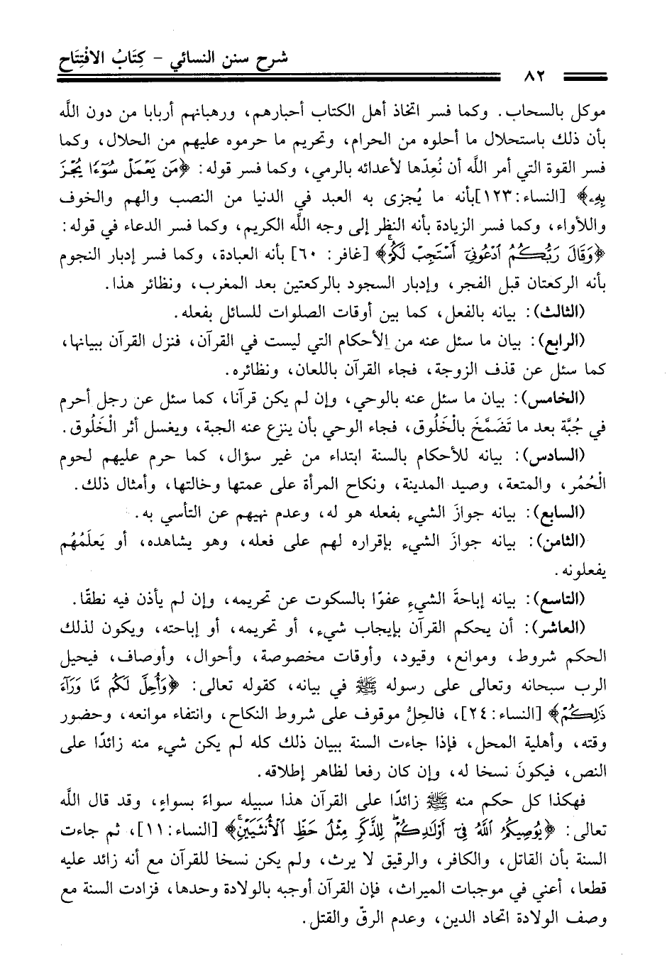 (العاشر): أن يحكم القرآن بإيجاب شيء، أو تحريمه، أو إباحته، ويكون لذلك الحكم شروط، وموانع، وقيود، وأوقات مخصوصة، وأحوال، وأوصاف، فيحيل الرب سبحانه وتعالى على رسوله - صلى الله عليه وسلم - في بيانه، كقوله تعالى: {وَأُحِلَّ لَكُمْ مَا وَرَاءَ ذَلِكُمْ} [النساء: 24]، فالحِلُّ موقوف على شروط النكاح، وانتفاء موانعه، وحضور وقته، وأهلية المحل، فإذا جاءت السنة ببيان ذلك كله لم يكن شيء منه زائدًا على النص، فيكونَ نسخا له، وإن كان رفعا لظاهر إطلاقه.