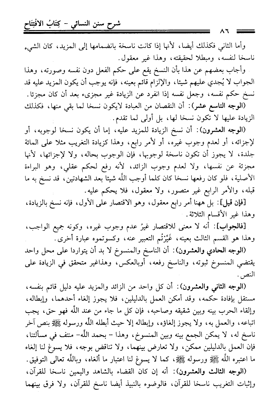 (الوجه العشرون): أن نسخ الزيادة للمزيد عليه، إما أن يكون نسخا لوجوبه، أو لإجزائه، أو لعدم وجوب غيره، أو لأمر رابع، وهذا كزيادة التغريب مثلا على المائة جلدة، لا يجوز أن تكون ناسخة لوجوبها، فإن الوجوب بحاله، ولا لإجزائها؛ لأنها مجزئة عن نفسها، ولا لعدم وجوب الزائد، لأنه رفع لحكم عقلي، وهو البراءة الأصلية، فلو كان رفعها نسخا كان كلما أوجب الله شيئًا بعد الشهادتين، قد نسخ به ما قبله، والأمر الرابع غير متصور، ولا معقول، فلا يحكم عليه.