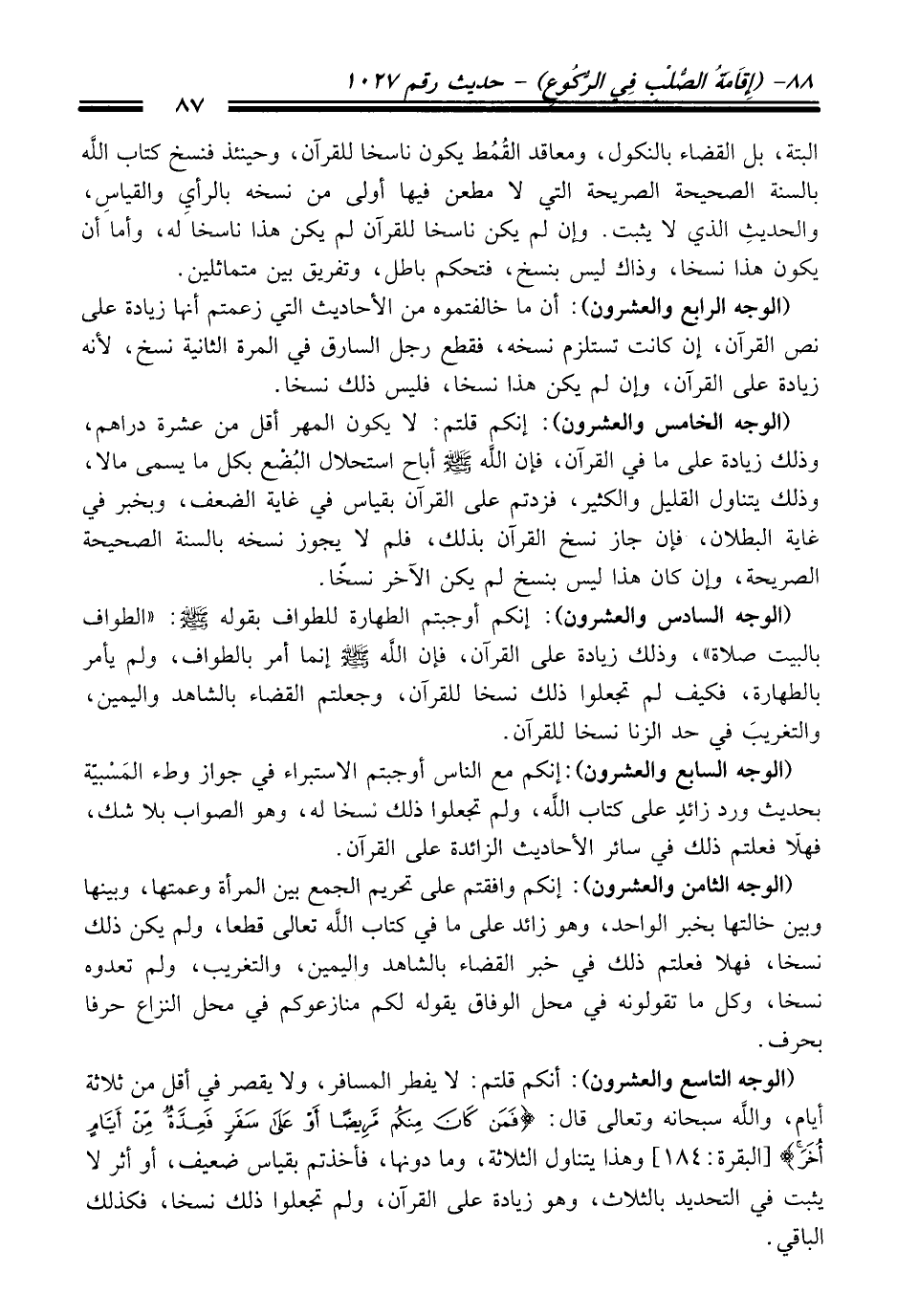 (الوجه الرابع والعشرون): أن ما خالفتموه من الأحاديث التي زعمتم أنها زيادة على نص القرآن، إن كانت نستلزم نسخه، فقطع رجل السارق في المرة الثانية نسخ، لأنه زيادة على القرآن، وإن لم يكن هذا نسخا، فليس ذلك نسخا.