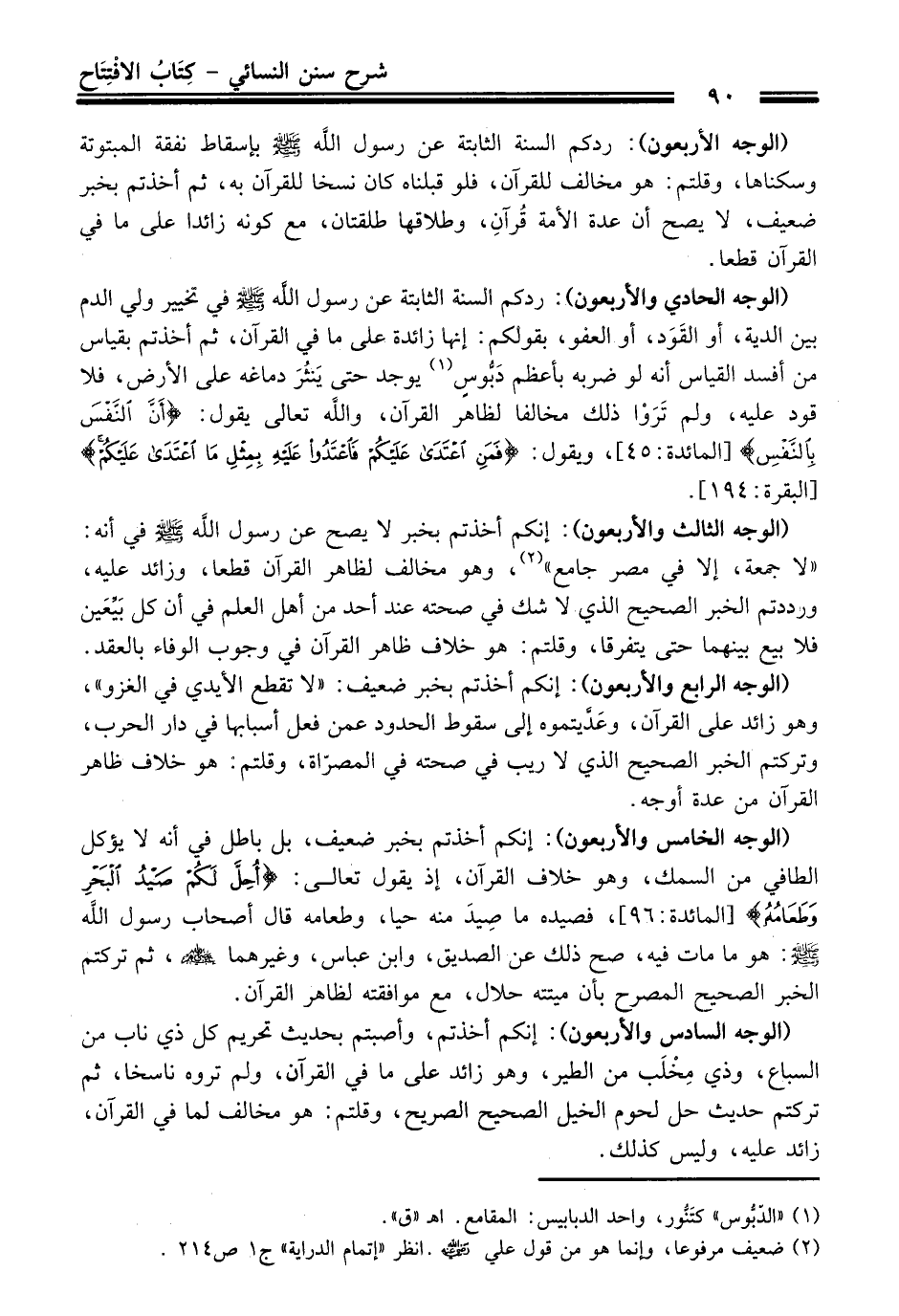 (الوجه الأربعون): ردكم السنة الثابتة عن رسول الله - صلى الله عليه وسلم - بإسقاط نفقة المبتوتة وسكناها، وقلتم: هو مخالف للقرآن، فلو قبلناه كان نسخا للقرآن به، ثم أخذتم بخبر ضعيف، لا يصح أن عدة الأمة قُرآنِ، وطلاقها طلقتان، مع كونه زائدا على ما في القرآن قطعا.