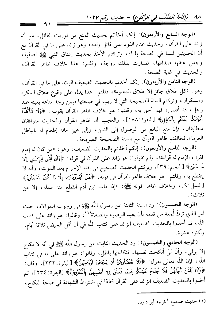(الوجه السابع والأربعون): إنكم أخذتم بحديث المنع من توريث القاتل، مع أنه زائد على القرآن، وحديث عدم القود على قاتل ولده، وهو زائد على ما في القرآن مع أن الحديثين ليسا في الصحة بذاك، وتركتم الأخذ بحديث إعتاق النبي - صلى الله عليه وسلم - لصفية، وجعل عتقها صداقها، فصارت بذلك زوجة، وقلتم: هذا خلاف ظاهر القرآن، والحديث في غاية الصحة.