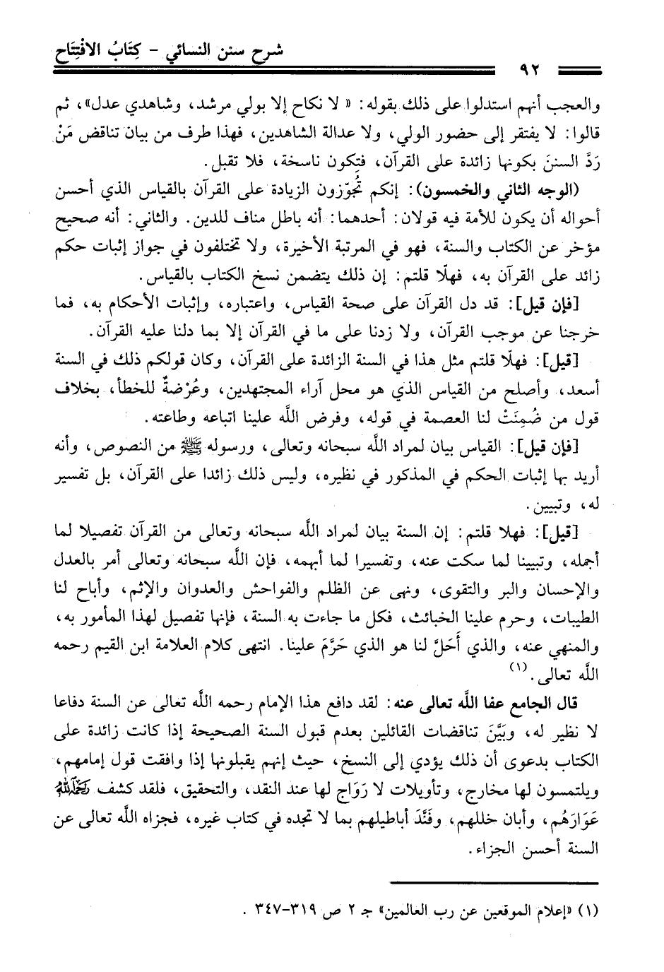 قال الجامع عفا الله تعالى عنه: لقد دافع هذا الإمام رحمه الله تعالى عن السنة دفاعا لا نظير له، وبَيَّنَ تناقضات القائلين بعدم قبول السنة الصحيحة إذا كانت زائدة على الكتاب بدعوى أن ذلك يؤدي إلى النسخ، حيث إنهم يقبلونها إذا وافقت قول إمامهم، ويلتمسون لها مخارج، وتأويلات لا رَوَاج لها عند النقد، والتحقيق، فلقد كشف -رحمه الله- عَوَارَهُم، وأبان خللهم، وفَنَّدَ أباطيلهم بما لا تجده في كتاب غيره، فجزاه الله تعالى عن السنة أحسن الجزاء.
