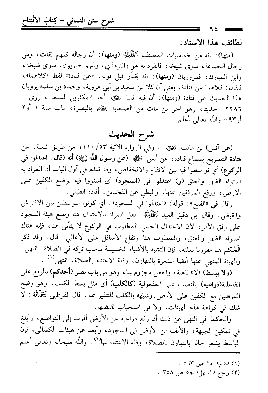 وقال في "الفتح": قوله: "اعتدلوا في السجود": أي كونوا متوسطين بين الافتراش والقبض. وقال ابن دقيق العيد -رحمه الله-: لعل المراد بالاعتدال هنا وضع هيئة السجود على وفق الأمر؛ لأن الاعتدال الحسي المطلوب في الركوع لا يتأتى هنا، فإنه هناك استواء الظهر والعنق، والمطلوب هنا ارتفاع الأسافل على الأعالي. قال: وقد ذكر الْحُكم هنا مقرونا بعلته، فإن التشبه بالأشياء الخسيسة يناسب تركه في الصلاة. انتهى. والهيئة المنهي عنها أيضا مشعرة بالتهاون، وقلة الاعتناء بالصلاة. انتهى (¬1).