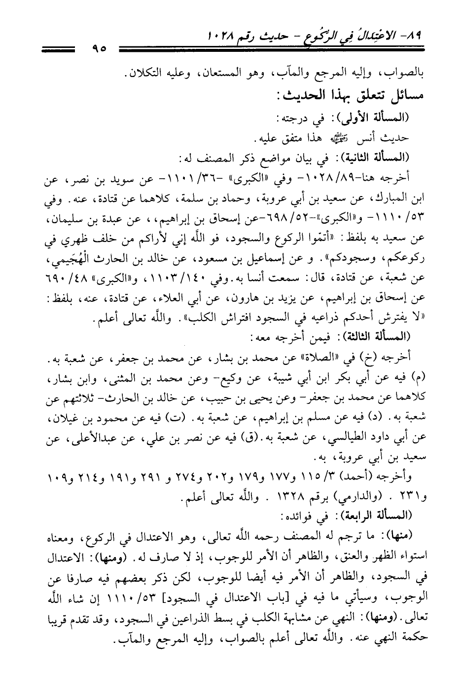 أخرجه هنا -89/ 1028 - وفي "الكبرى" -36/ 1101 - عن سويد بن نصر، عن ابن المبارك، عن سعيد بن أبي عروبة، وحماد بن سلمة، كلاهما عن قتادة، عنه. وفي 53/ 1110 - و"الكبرى" -52/ 698 - عن إسحاق بن إبراهيم، عن عبدة بن سليمان، عن سعيد به بلفظ؛ "أتمّوا الركوع والسجود، فو الله إني لأراكم من خلف ظهري في ركوعكم، وسجودكم". وعن إسماعيل بن مسعود، عن خالد بن الحارث الْهُجَيمي، عن شعبة، عن قتادة، قال: سمعت أنسا به. وفي 140/ 1103، و"الكبرى" 48/ 690 عن إسحاق بن إبراهيم، عن يزيد بن هارون، عن أبي العلاء، عن قتادة، عنه، بلفظ: "لا يفترش أحدكم ذراعيه في السجود افتراش الكلب". والله تعالى أعلم.