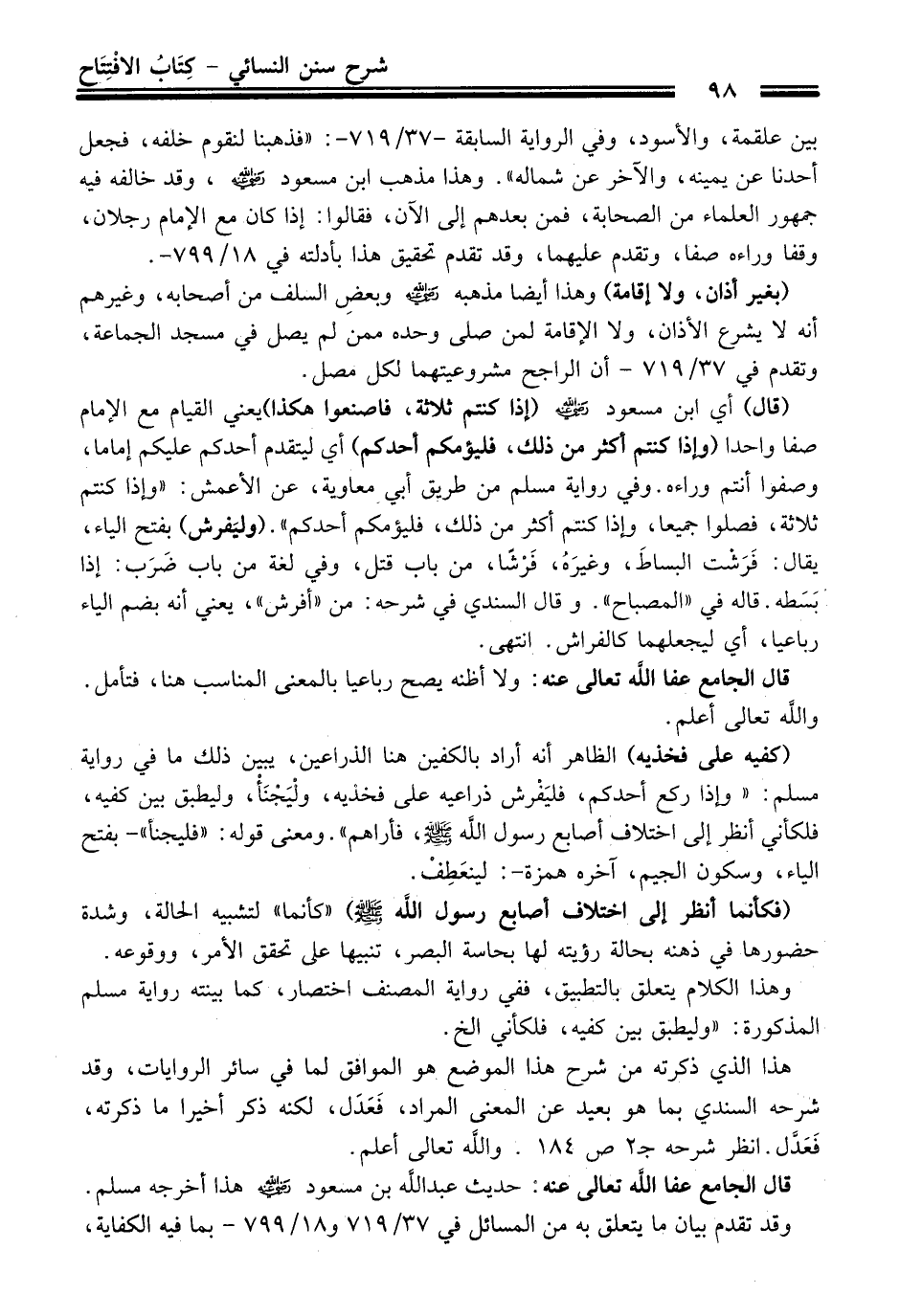 بين علقمة، والأسود، وفي الرواية السابقة -37/ 719 - : "فذهبنا لنقوم خلفه، فجعل أحدنا عن يمينه، والآخر عن شماله". وهذا مذهب ابن مسعود - رضي الله عنه -، وقد خالفه فيه جمهور العلماء من الصحابة، فمن بعدهم إلى الآن، فقالوا: إذا كان مع الإمام رجلان، وقفا وراءه صفا، وتقدم عليهما، وقد تقدم تحقيق هذا بأدلته في 18/ 799 - .