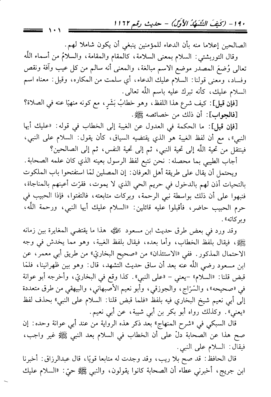 [فإن قيل]: ما الحكمة في العدول عن الغيبة إلى الخطاب في قوله: "عليك أيها النبي"، مع أن لفظ الغيبة هو الذي يقتضيه السياق، كأن يقول: السلام على النبي، فينتقل من تحية الله إلى تحية النبي، ثم إلى تحية النفس، ثم إلى الصالحين؟