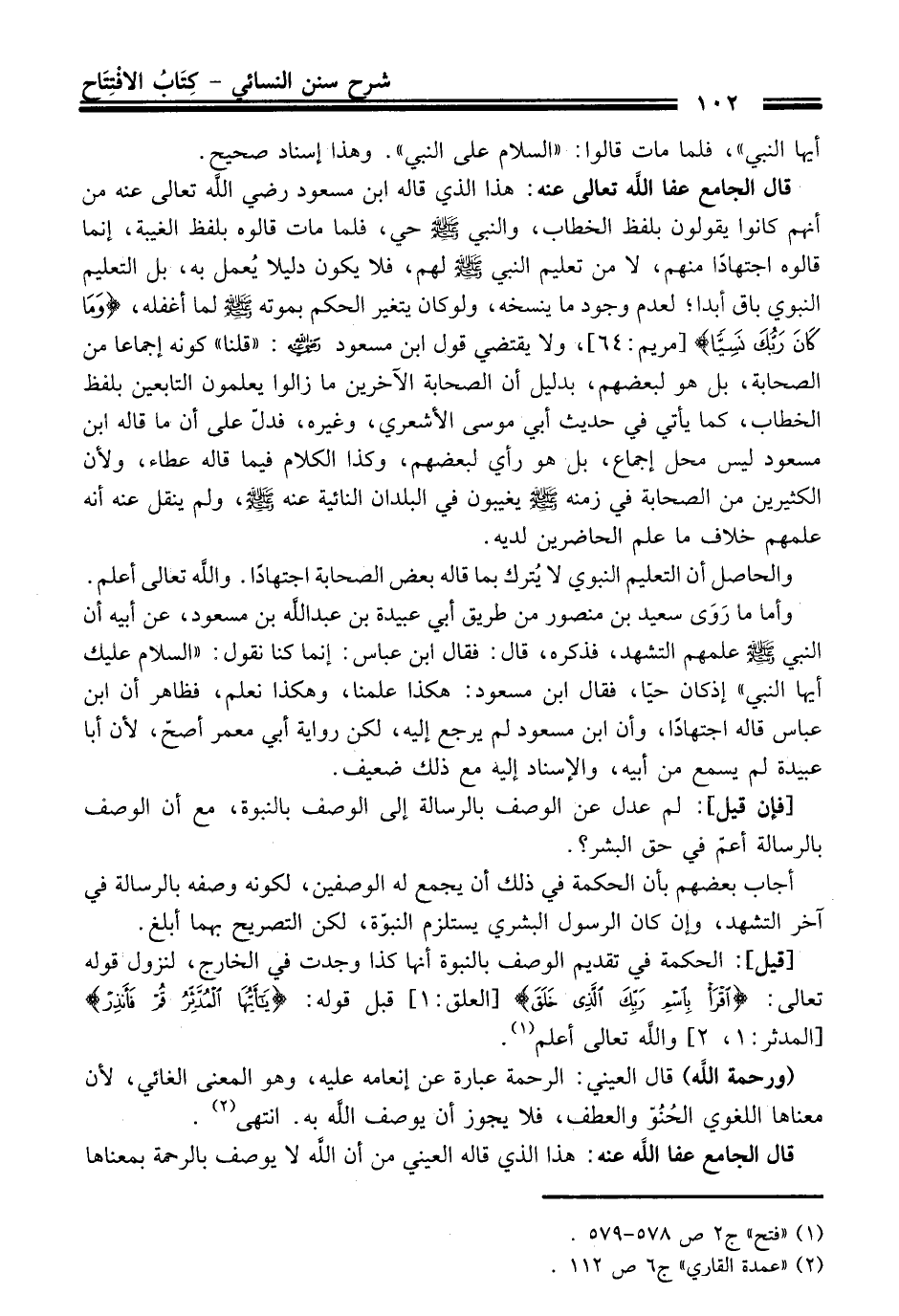 قال الجامع عفا الله تعالى عنه: هذا الذي قاله ابن مسعود رضي الله تعالى عنه من أنهم كانوا يقولون بلفظ الخطاب، والنبي - صلى الله عليه وسلم - حي، فلما مات قالوه بلفظ الغيبة، إنما قالوه اجتهادًا منهم، لا من تعليم النبي - صلى الله عليه وسلم - لهم، فلا يكون دليلا يُعمل به، بل التعليم النبوي باق أبدا؛ لعدم وجود ما ينسخه، ولو كان يتغير الحكم بموته - صلى الله عليه وسلم - لما أغفله، {وَمَا خَلْفَنَا وَمَا بَيْنَ ذَلِكَ وَمَا كَانَ رَبُّكَ نَسِيًّا} [مريم: 64]، ولا يقتضي قول ابن مسعود - رضي الله عنه -: "قلنا" كونه إجماعا من الصحابة، بل هو لبعضهم، بدليل أن الصحابة الآخرين ما زالوا يعلمون التابعين بلفظ الخطاب، كما يأتي في حديث أبي موسى الأشعري، وغيره، فدلّ على أن ما قاله ابن مسعود ليس محل إجماع، بل هو رأي لبعضهم، وكذا الكلام فيما قاله عطاء، ولأن الكثيرين من الصحابة في زمنه - صلى الله عليه وسلم - يغيبون في البلدان النائية عنه - صلى الله عليه وسلم -، ولم ينقل عنه أنه علمهم خلاف ما علم الحاضرين لديه.