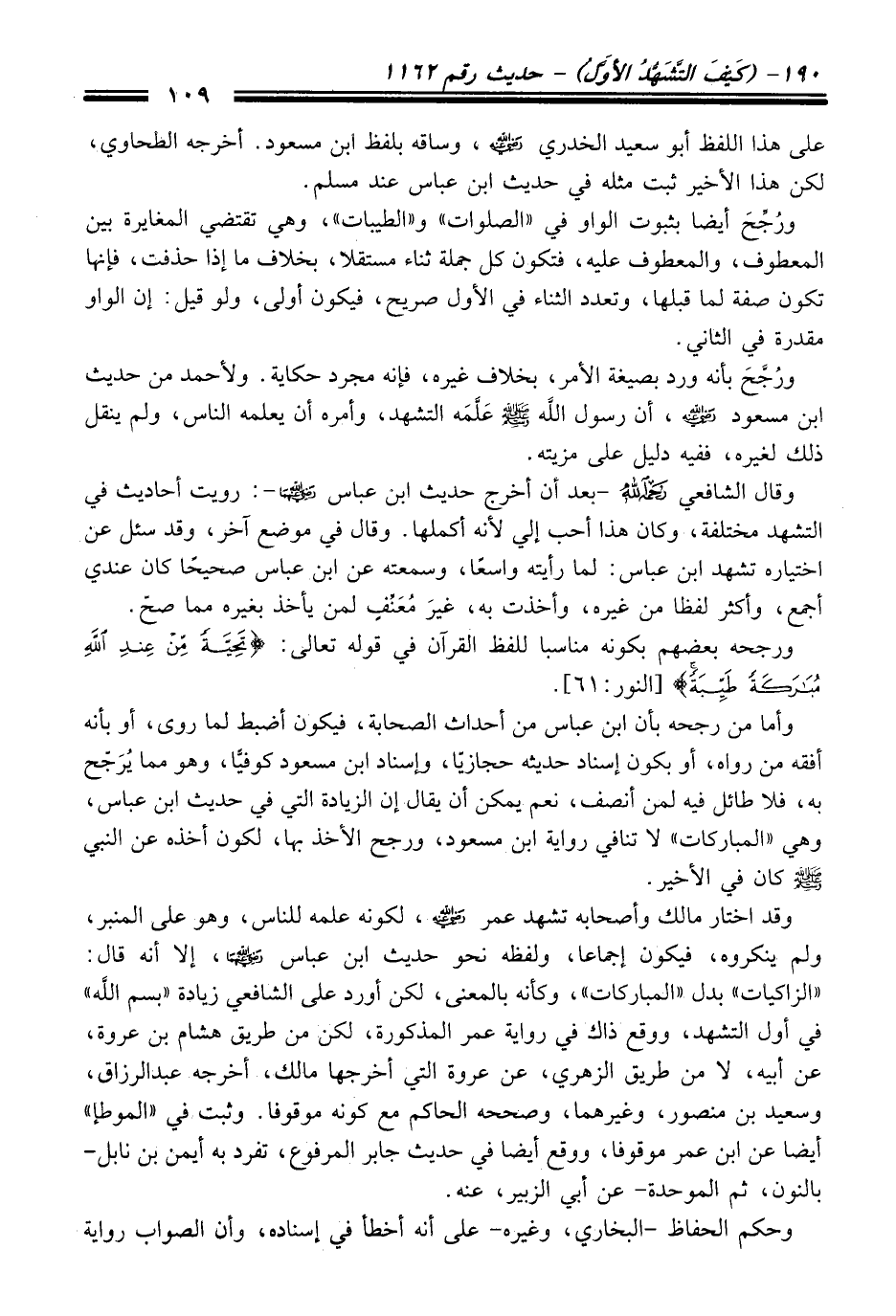 وقال الشافعي -رحمه الله- بعد أن أخرج حديث ابن عباس - رضي الله عنهما -: رويت أحاديث في التشهد مختلفة، وكان هذا أحب إلى لأنه أكملها. وقال في موضع آخر، وقد سئل عن اختياره تشهد ابن عباس: لما رأيته واسعًا، وسمعته عن ابن عباس صحيحًا كان عندي أجمع، وأكثر لفظا من غيره، وأخذت به، غيرَ مُعَنِّفٍ لمن يأخذ بغيره مما صحّ.