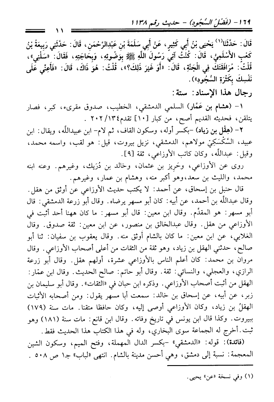 قَالَ: حَدَّثَنَا (¬1) يَحْيَى بْنُ أَبِي كَثِيرٍ، عَنْ أَبِي سَلَمَةَ بْنِ عَبْدِ الرَّحْمَنِ، قَالَ: حَدَّثَنِي رَبِيعَةُ بْنُ كَعْبٍ الأَسْلَمِيُّ، قَالَ: كُنْتُ آتِي رَسُولَ اللَّهِ - صلى الله عليه وسلم - بِوَضُوئِهِ، وَبِحَاجَتِهِ، فَقَالَ: "سَلْنِي"، قُلْتُ: مُرَافَقَتَكَ فِي الْجَنَّةِ، قَالَ: "أَوَ غَيْرَ ذَلِكَ؟ "، قُلْتُ: هُوَ ذَاكَ، قَالَ: "فَأَعِنِّي عَلَى نَفْسِكَ بِكَثْرَةِ السُّجُودِ").