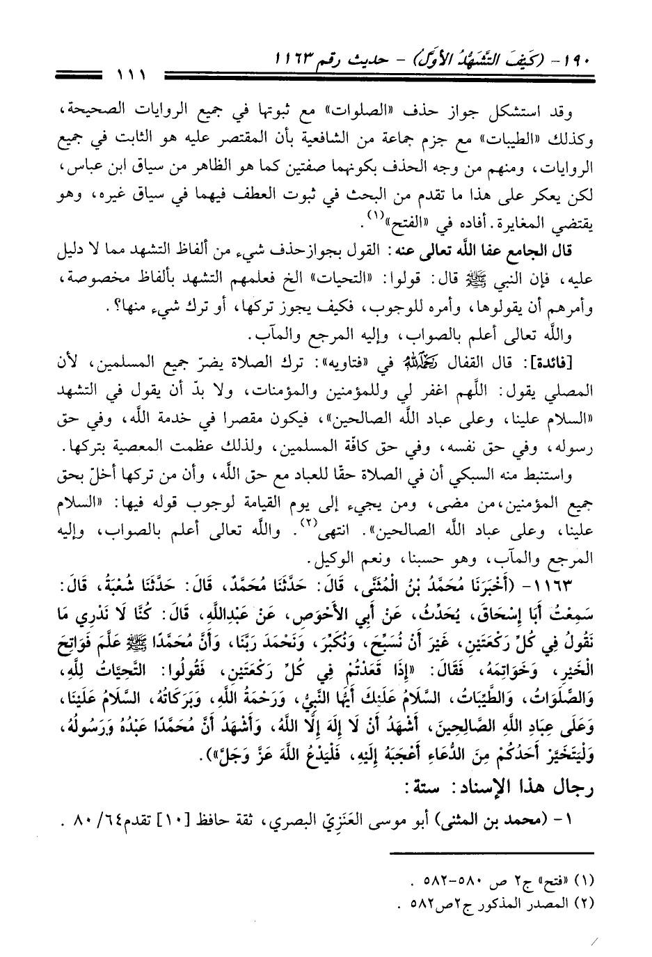 1163 - (أَخْبَرَنَا مُحَمَّدُ بْنُ الْمُثَنَّى، قَالَ: حَدَّثَنَا مُحَمَّدٌ، قَالَ: حَدَّثَنَا شُعْبَةُ، قَالَ: سَمِعْتُ أَبَا إِسْحَاقَ، يُحَدِّثُ، عَنْ أَبِي الأَحْوَصِ، عَنْ عَبْدِ اللَّهِ، قَالَ: كُنَّا لاَ نَدْرِي مَا نَقُولُ فِي كُلِّ رَكْعَتَيْنِ، غَيْرَ أَنْ نُسَبِّحَ، وَنُكَبِّرَ، وَنَحْمَدَ رَبَّنَا، وَأَنَّ مُحَمَّدًا - صلى الله عليه وسلم - عُلِّمَ فَوَاتِحَ الْخَيْرِ، وَخَوَاتِمَهُ، فَقَالَ: "إِذَا قَعَدْتُمْ فِي كُلِّ رَكْعَتَيْنِ، فَقُولُوا: التَّحِيَّاتُ لِلَّهِ، وَالصَّلَوَاتُ، وَالطَّيِّبَاتُ، السَّلاَمُ عَلَيْكَ أَيُّهَا النَّبِيُّ، وَرَحْمَةُ اللَّهِ، وَبَرَكَاتُهُ، السَّلاَمُ عَلَيْنَا، وَعَلَى عِبَادِ اللَّهِ الصَّالِحِينَ، أَشْهَدُ أَنْ لاَ إِلَهَ إِلَّا اللَّهُ، وَأَشْهَدُ أَنَّ مُحَمَّدًا عَبْدُهُ وَرَسُولُهُ، وَلْيَتَخَيَّرْ أَحَدُكُمْ مِنَ الدُّعَاءِ أَعْجَبَهُ إِلَيْهِ، فَلْيَدْعُ اللَّهَ عَزَّ وَجَلَّ").