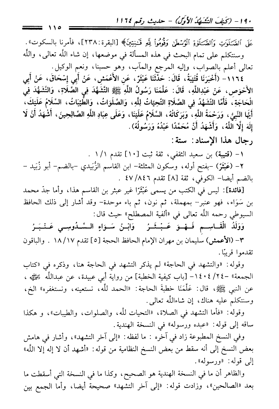 1164 - (أَخْبَرَنَا قُتَيْبَةُ، قَالَ: حَدَّثَنَا عَبْثَرٌ، عَنِ الأَعْمَشِ، عَنْ أَبِي إِسْحَاقَ، عَنْ أَبِي الأَحْوَصِ، عَنْ عَبْدِ اللَّهِ، قَالَ: عَلَّمَنَا رَسُولُ اللَّهِ - صلى الله عليه وسلم - التَّشَهُّدَ فِي الصَّلاَةِ، وَالتَّشَهُّدَ فِي الْحَاجَةِ، فَأَمَّا التَّشَهُّدُ فِي الصَّلاَةِ التَّحِيَّاتُ لِلَّهِ، وَالصَّلَوَاتُ، وَالطَّيِّبَاتُ، السَّلاَمُ عَلَيْكَ، أَيُّهَا النَّبِيُّ، وَرَحْمَةُ اللَّهِ، وَبَرَكَاتُهُ، السَّلاَمُ عَلَيْنَا، وَعَلَى عِبَادِ اللَّهِ الصَّالِحِينَ، أَشْهَدُ أَنْ لاَ إِلَهَ إِلاَّ اللَّهُ، وَأَشْهَدُ أَنَّ مُحَمَّدًا عَبْدُهُ وَرَسُولُهُ).
