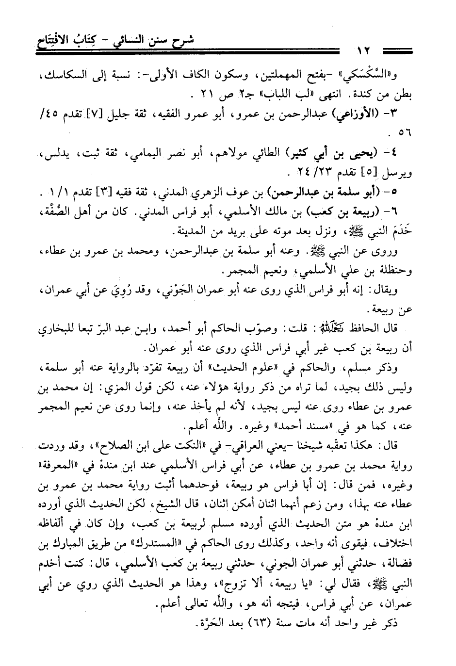 قال: هكذا تعقّبه شيخنا -يعني العراقي- في "النكت على ابن الصلاح"، وقد وردت رواية محمَّد بن عمرو بن عطاء، عن أبي فرأس الأسلمي عند ابن مندهْ في "المعرفة" وغيره، فمن قال: إن أبا فراس هو ربيعة، فوحدهما أثبت رواية محمَّد بن عمرو بن عطاء عنه بهذا، ومن زعم أنهما اثنان أمكن اثنان، قال الشيخ، لكن الحديث الذي أورده ابن مندهْ هو متن الحديث الذي أورده مسلم لربيعة بن كعب، وإن كان في ألفاظه اختلاف، فيقوى أنه واحد، وكذلك روى الحاكم في "المستدرك" من طريق المبارك بن فضالة، حدثني أبو عمران الجوني، حدثني ربيعة بن كعب الأسلمي، قال: كنت أخدم النبي - صلى الله عليه وسلم -، فقال لي: "يا ربيعة، ألا تزوج"، وهذا هو الحديث الذي روي عن أبي عمران، عن أبي فراس، فيتجه أنه هو، والله تعالى أعلم.