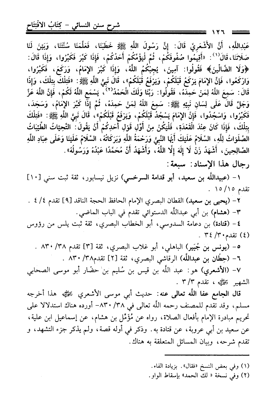 عَبْدِ اللَّهِ، أَنَّ الأَشْعَرِيَّ قَالَ: إِنَّ رَسُولَ اللَّهِ - صلى الله عليه وسلم - خَطَبَنَا، فَعَلَّمَنَا سُنَّتَنَا، وَبَيَّنَ لَنَا صَلاَتَنَا، قَالَ (¬1): "أَقِيمُوا صُفُوفَكُمْ، ثُمَّ لْيَؤُمَّكُمْ أَحَدُكُمْ، فَإِذَا كَبَّرَ فَكَبِّرُوا، وَإِذَا قَالَ: {وَلاَ الضَّالِّينَ} فَقُولُوا: آمِينَ، يُجِبْكُمُ اللَّهُ، وَإِذَا كَبَّرَ الإِمَامُ، وَرَكَعَ، فَكَبِّرُوا، وَارْكَعُوا، فَإِنَّ الإِمَامَ يَرْكَعُ قَبْلَكُمْ، وَيَرْفَعُ قَبْلَكُمْ"، قَالَ نَبِيُّ اللَّهِ - صلى الله عليه وسلم -: "فَتِلْكَ بِتِلْكَ، وَإِذَا قَالَ: سَمِعَ اللَّهُ لِمَنْ حَمِدَهُ، فَقُولُوا: رَبَّنَا لَكَ الْحَمْدُ (¬2)، يَسْمَعِ اللَّهُ لَكُمْ، فَإِنَّ اللَّهَ عَزَّ وَجَلَّ قَالَ عَلَى لِسَانِ نَبِيِّهِ - صلى الله عليه وسلم -: سَمِعَ اللَّهُ لِمَنْ حَمِدَهُ، ثُمَّ إِذَا كَبَّرَ الإِمَامُ، وَسَجَدَ، فَكَبِّرُوا، وَاسْجُدُوا، فَإِنَّ الإِمَامَ يَسْجُدُ قَبْلَكُمْ، وَيَرْفَعُ قَبْلَكُمْ"، قَالَ نَبِيُّ اللَّهِ - صلى الله عليه وسلم -: "فَتِلْكَ بِتِلْكَ، فَإِذَا كَانَ عِنْدَ الْقَعْدَةِ، فَلْيَكُنْ مِنْ أَوَّلِ قَوْلِ أَحَدِكُمْ أَنْ يَقُولَ: التَّحِيَّاتُ الطَّيِّبَاتُ الصَّلَوَاتُ لِلَّهِ، السَّلاَمُ عَلَيْكَ أَيُّهَا النَّبِيُّ وَرَحْمَةُ اللَّهِ وَبَرَكَاتُهُ، السَّلاَمُ عَلَيْنَا وَعَلَى عِبَادِ اللَّهِ الصَّالِحِينَ، أَشْهَدُ أَنْ لاَ إِلَهَ إِلاَّ اللَّهُ، وَأَشْهَدُ أَنَّ مُحَمَّدًا عَبْدُهُ وَرَسُولُهُ».