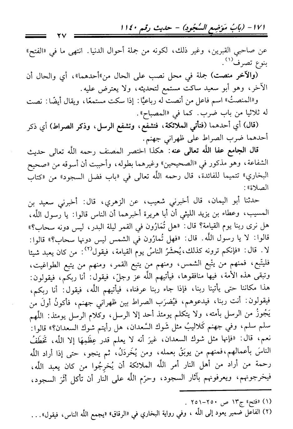 قال الجامع عفا الله تعالى عنه: هكذا اختصر المصنف رحمه الله تعالى حديث الشفاعة، وهو مذكور في "الصحيحين" وغيرهما بطوله، وأحببت أن أسوقه من "صحيح البخاري" تتميما للفائدة، قال رحمه الله تعالى في "باب فضل السجود" من "كتاب الصلاة":